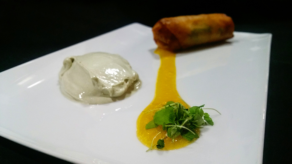 Maak een mooie streep passievruchtcoulis op de borden en leg de loempia en een bolletje ijs ertegenaan. Versier met blaadjes cress.