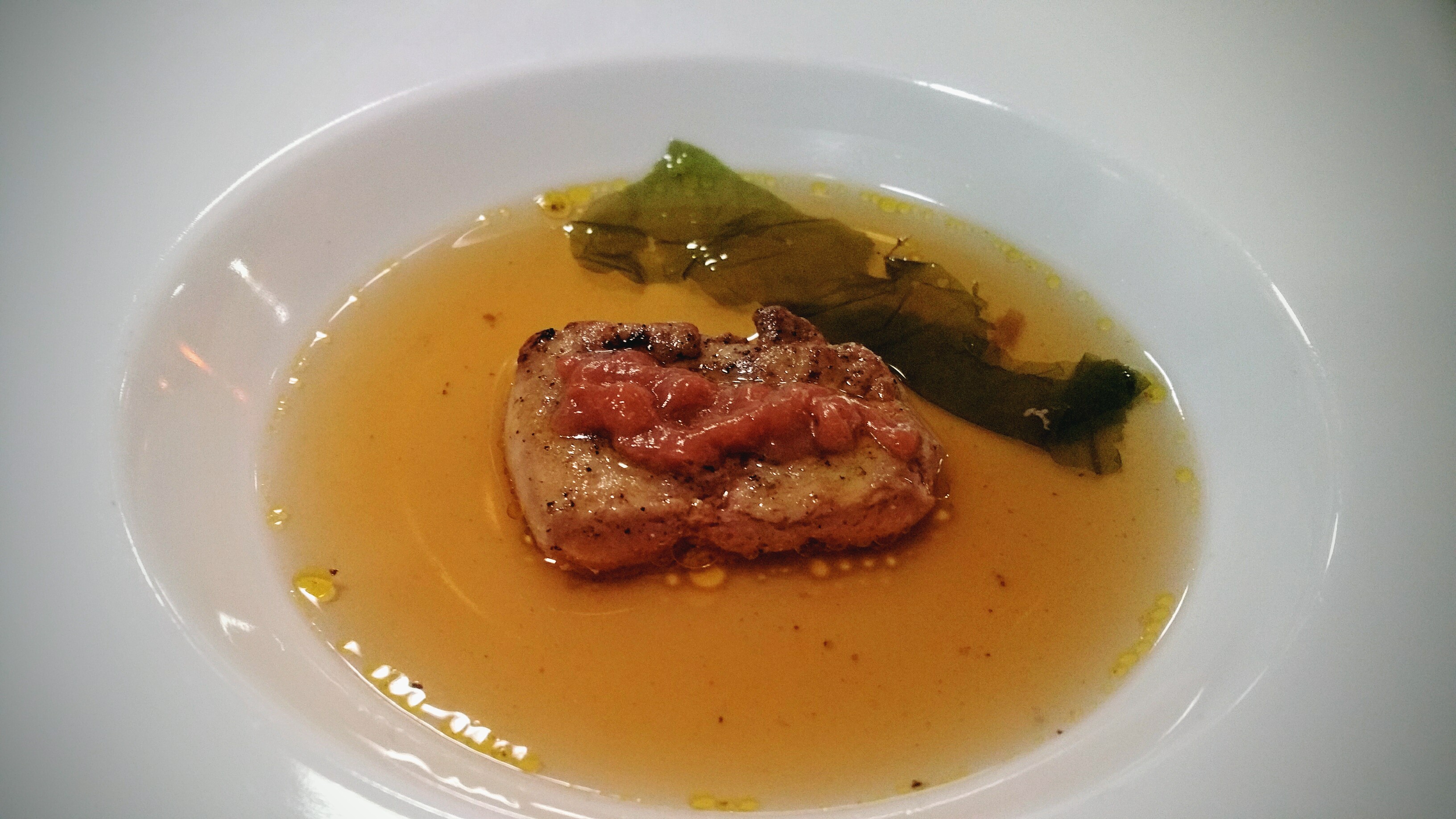 Snij de eendenlever schuin weg in 2 stukken. Doe een kleine soeplepel dashi over de komboden. Versier met een blaadje zeesla. Leg de eendenlever in de dashi en spuit er wat umeboshicrème op.