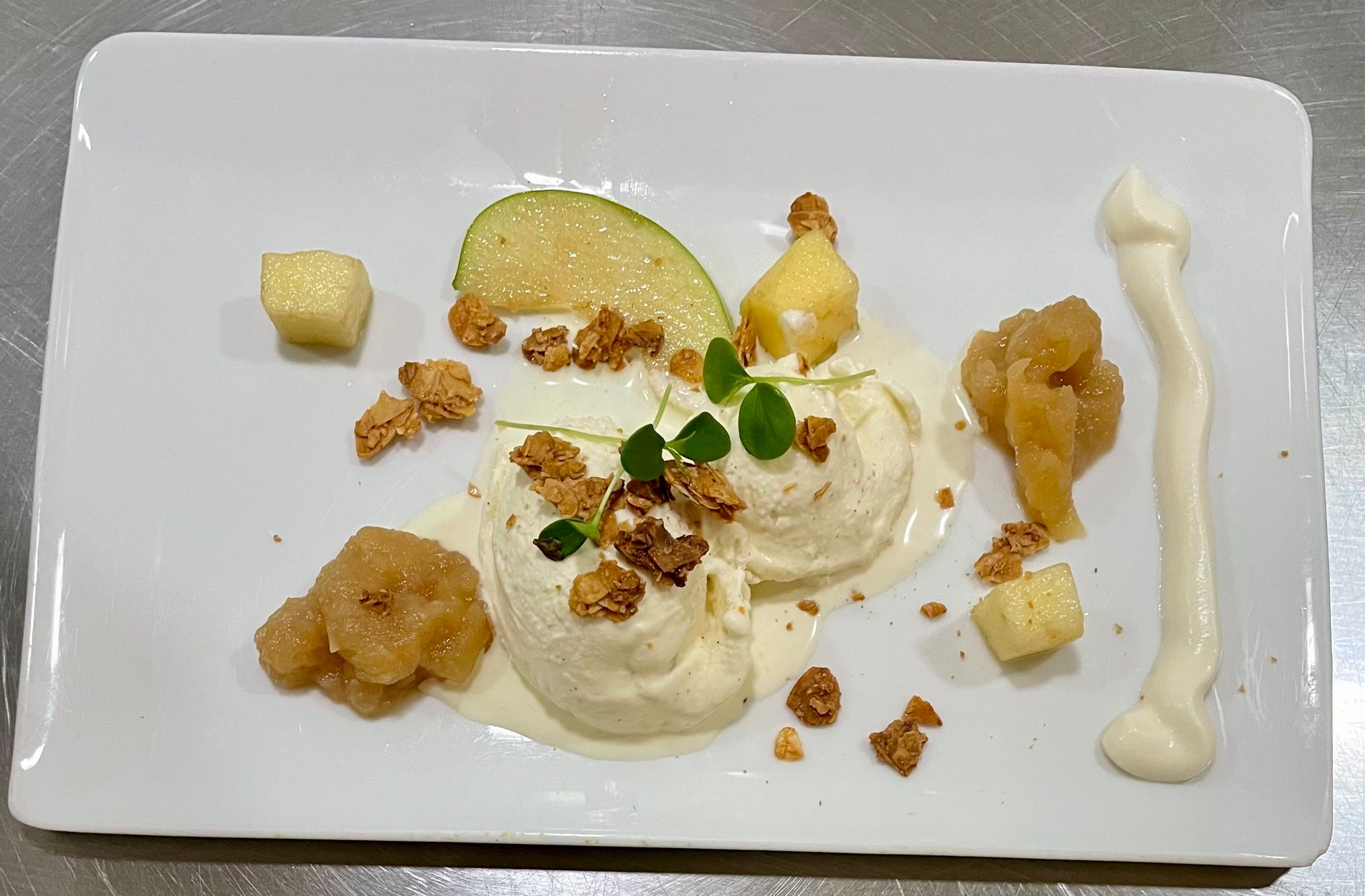 Spuit een kronkelige baan yoghurtcrème op de borden. Plaats een quenelle ijs midden op de borden. Versier het bord met dotjes compote, amandelkrokant en appel.