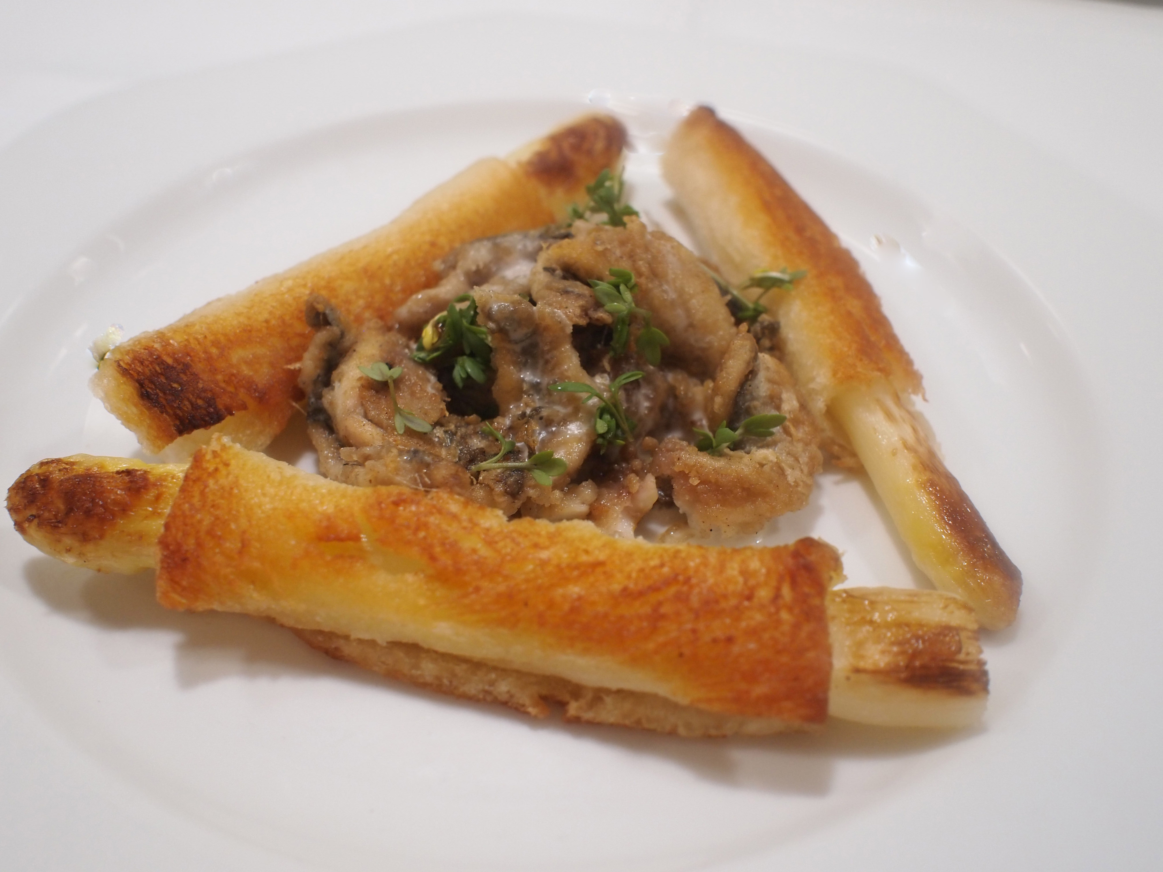 Schil de asperges tweemaal. Snij de kontjes eraf. Kook de asperges in gezouten water beetgaar. Spoel direct af met koud water. Geef 2 dl kookvocht door aan de olijfoliesaus. Snij de onderste deel van de asperges af en geef door aan het voorgerecht. Houd 10-12 cm van de bovenkant apart. Snij de korsten van het brood. Rol de plakjes brood dun uit met een deegroller. Dep de asperges goed droog en wikkel een plakje brood strak om de asperge. Snij overtollig brood weg. Bak asperges rustig in ruim geklaarde boter tot het brood goudbruin en krokant is. Begin hier tijdig mee.