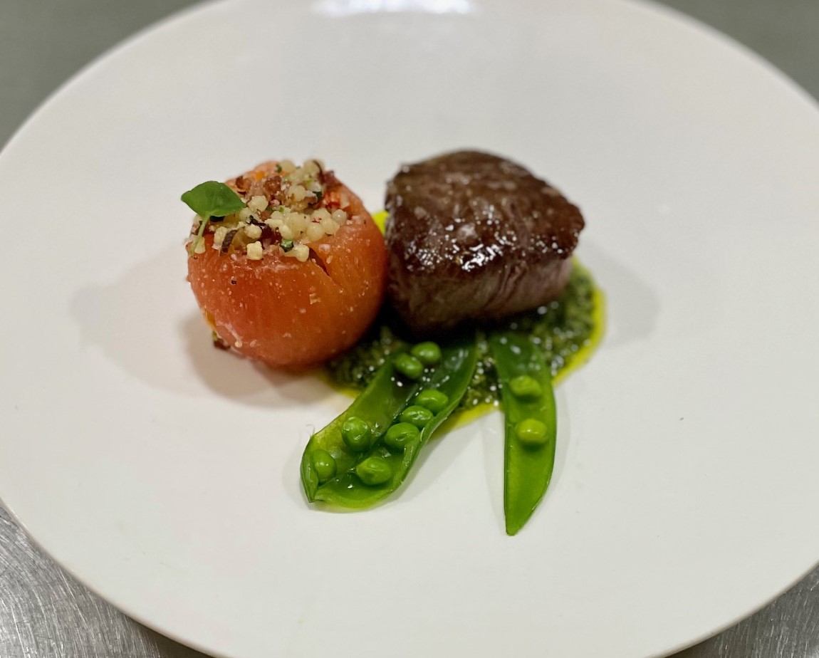 Maak een spiegel van pesto. Snij het vlees in tweeën. Leg een stuk vlees met de snijkant naar boven in de pesto. Bestrooi het vlees met Maldon zout en wat gerookte olijfolie. Leg twee tomaten op de borden. Versier het geheel met sugar snaps en basilicum cress.