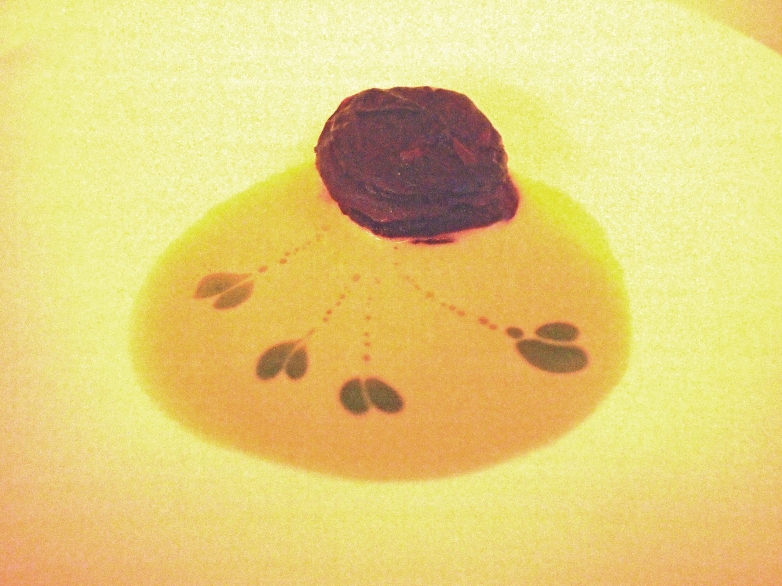 Leg een stapeltje biet op de borden. Schenk de beurre blanc rondom. Druppel wat peterselieolie in de beurre blanc.