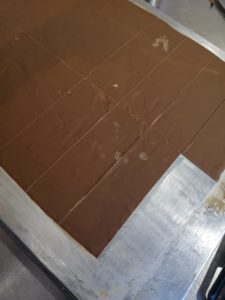 - Chocolademantel. Plaat uit de diepvries. Op kamertemperatuur laten komen en maak met een paletmes plakken. Zie foto. Om moussecakeje heenvouwen. (Zie filmpje). Leg op het bord.