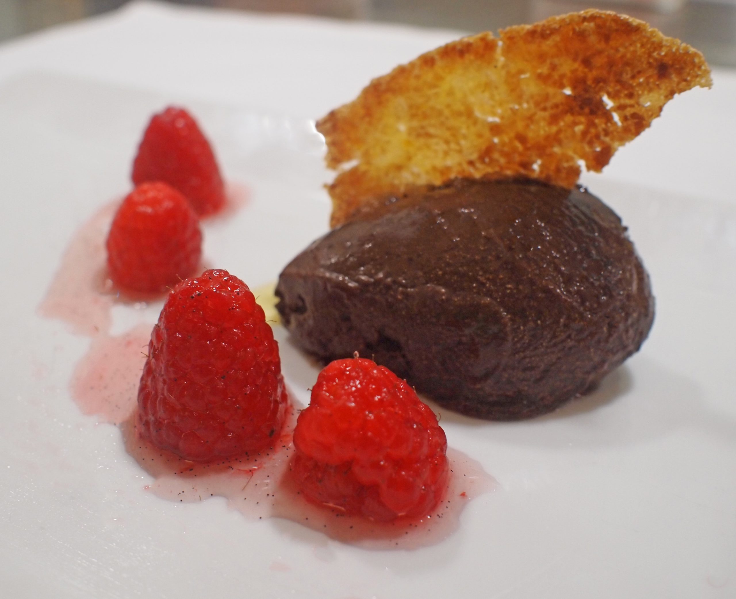 Maak een mooie quenelle van chocolademousse en plaats midden op de borden. Schenk een theelepeltje olijfolie over de chocolademousse en wat vlokken Maldon zout. Verdeel de frambozen rondom de mousse