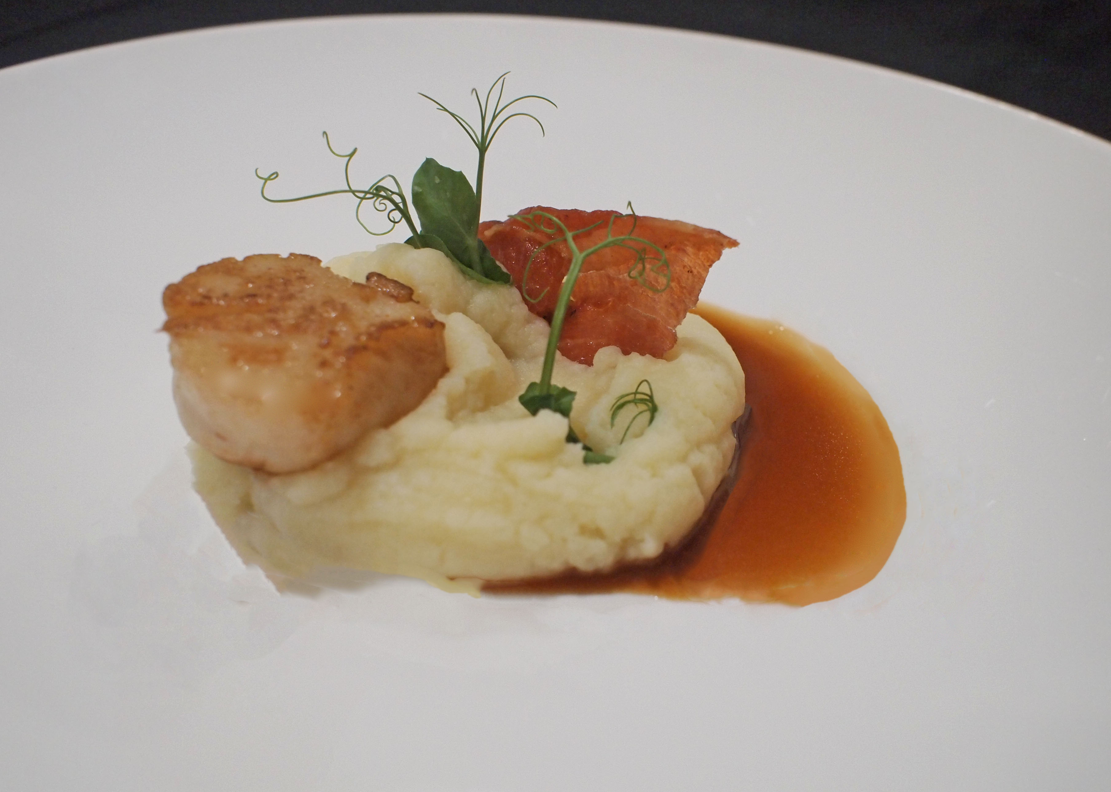 Maak een streep bloemkoolmousseline op de borden. Leg een coquille op de bloemkool. Lepel saus rondom en steek een stukje parmaham in de mousseline. Versier met takjes affila cress