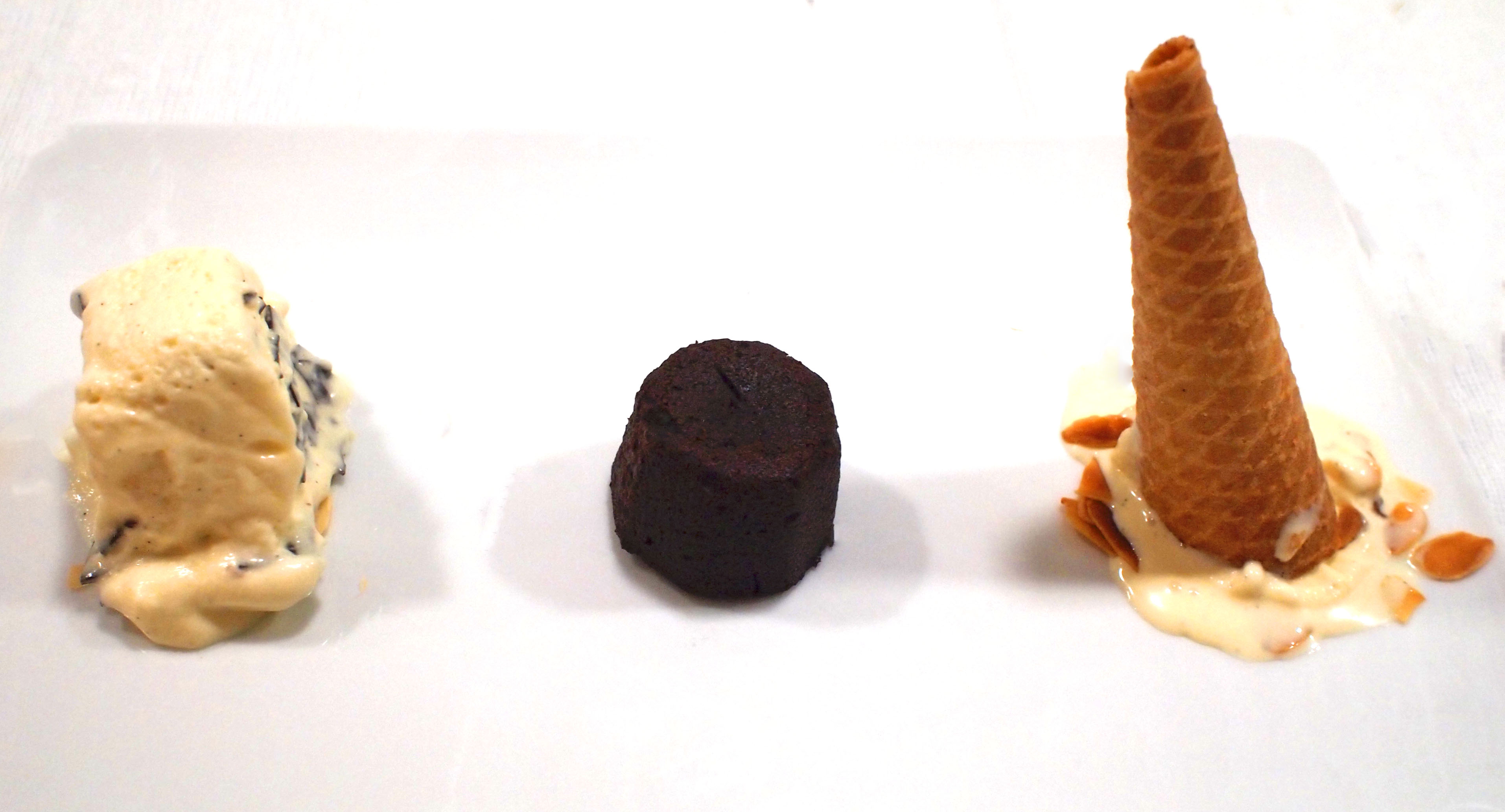 Doe een bolletje vanille-ijs in de oubliehoorntjes en zet deze ondersteboven op een hoopje amandel. Schenk wat chocoladesaus eromheen. Leg een viennetta op het andere hoopje schaafsel.