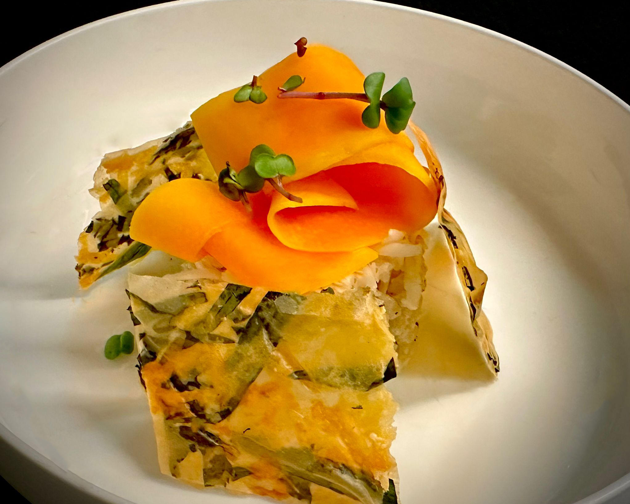 19.Smeer een stukje bakpapier in met olijfolie en leg er een plakje filodeeg op. Verdeel wat van de munt en dragon over het deeg en rasp er wat oude kaas over.