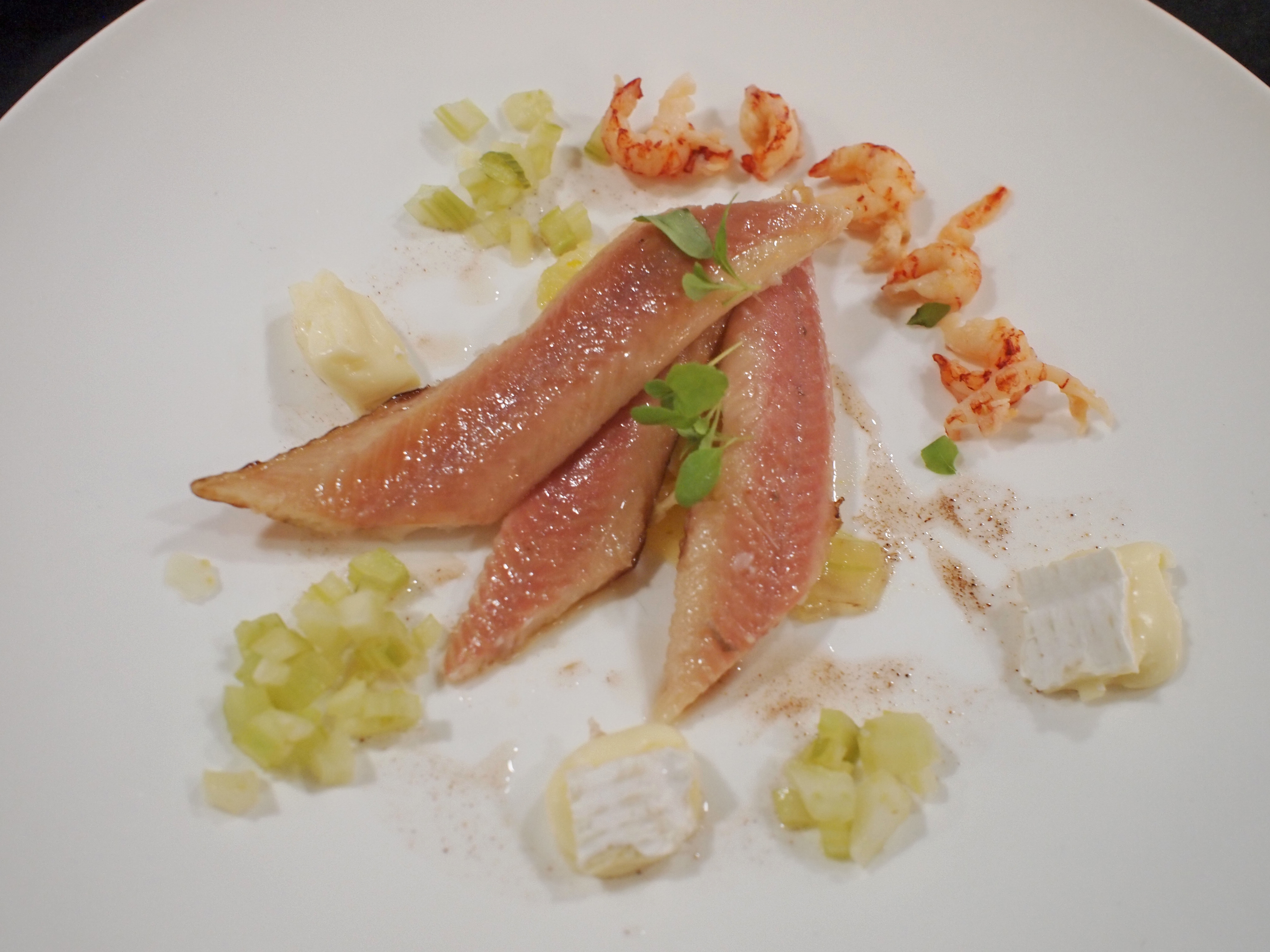 Snij de camembert in kleine blokjes. Leg een plukje venkel midden op de borden. Verdeel de blokjes camembert en bleekselderij rondom. Druppel een eetlepel steranijsolie rondom. Spuit wat dotjes citroencrème rondom. Verdeel de rivierkreeftjes en paling op de borden en schenk de palingcoulis over het geheel. Versier met Affilla cress.