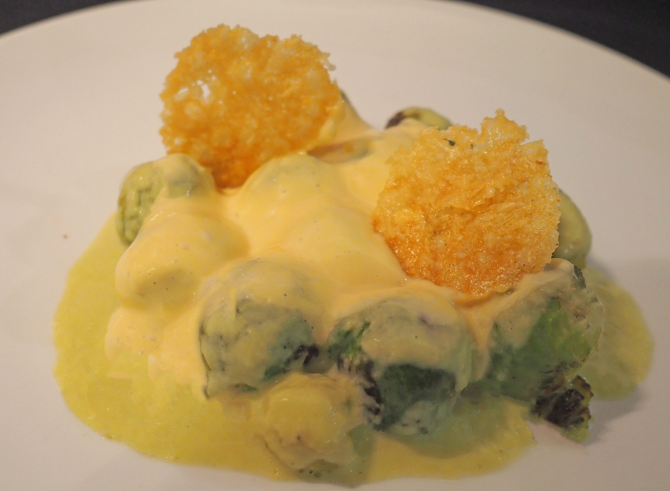 Spuit de Hollandaise er op en leg er een of twee tuiles op.