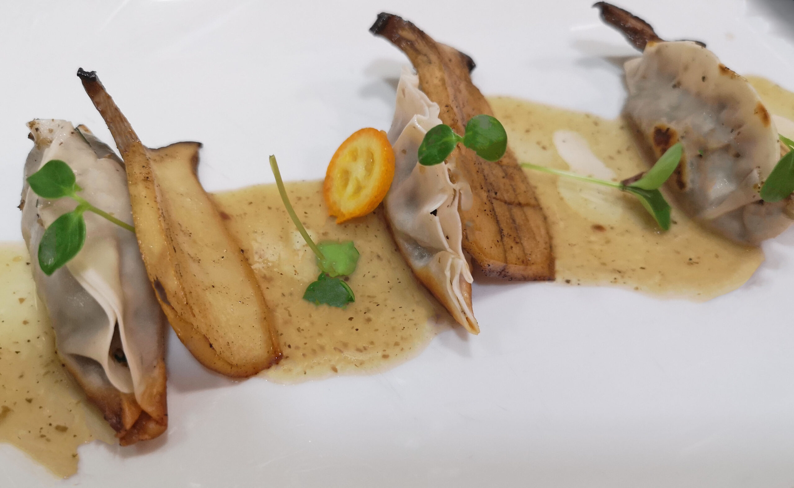 Leg drie gyoza op een bord. leg de koningsboleten er tegenaan. Versier met Tahooncress en plakjes kumquat. Schenk wat paddenstoelsaus rondom. Druppel een theelepel theeolie in de saus.