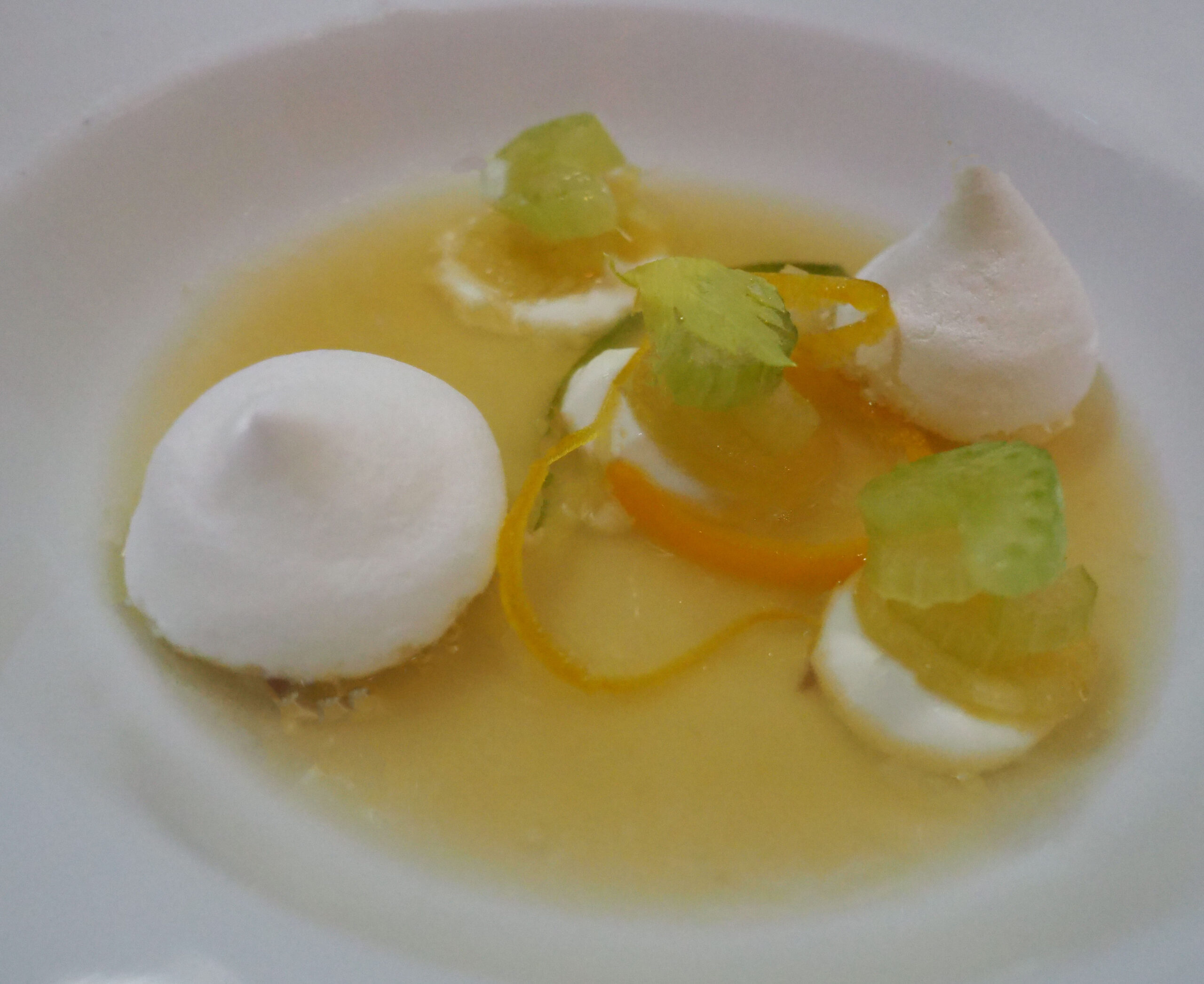 meringue en crème fraîche parels over de borden. Verdeel de zestes