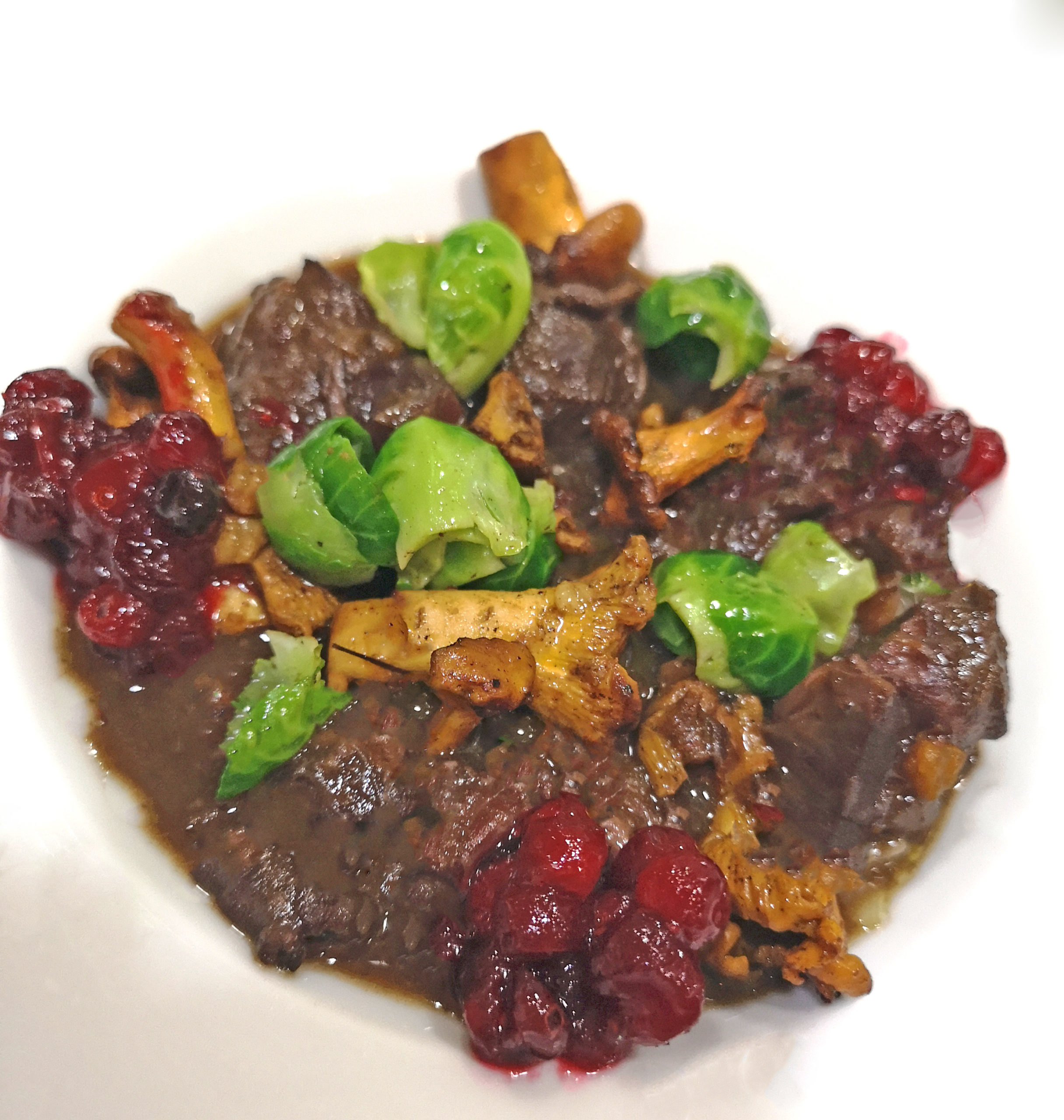 Verdeel de witlof over de komborden. Hierop de hazenpeper verdelen. Plaats enkele theelepeltjes veenbessen op het geheel en versier met de paddenstoelen en spruitjes.