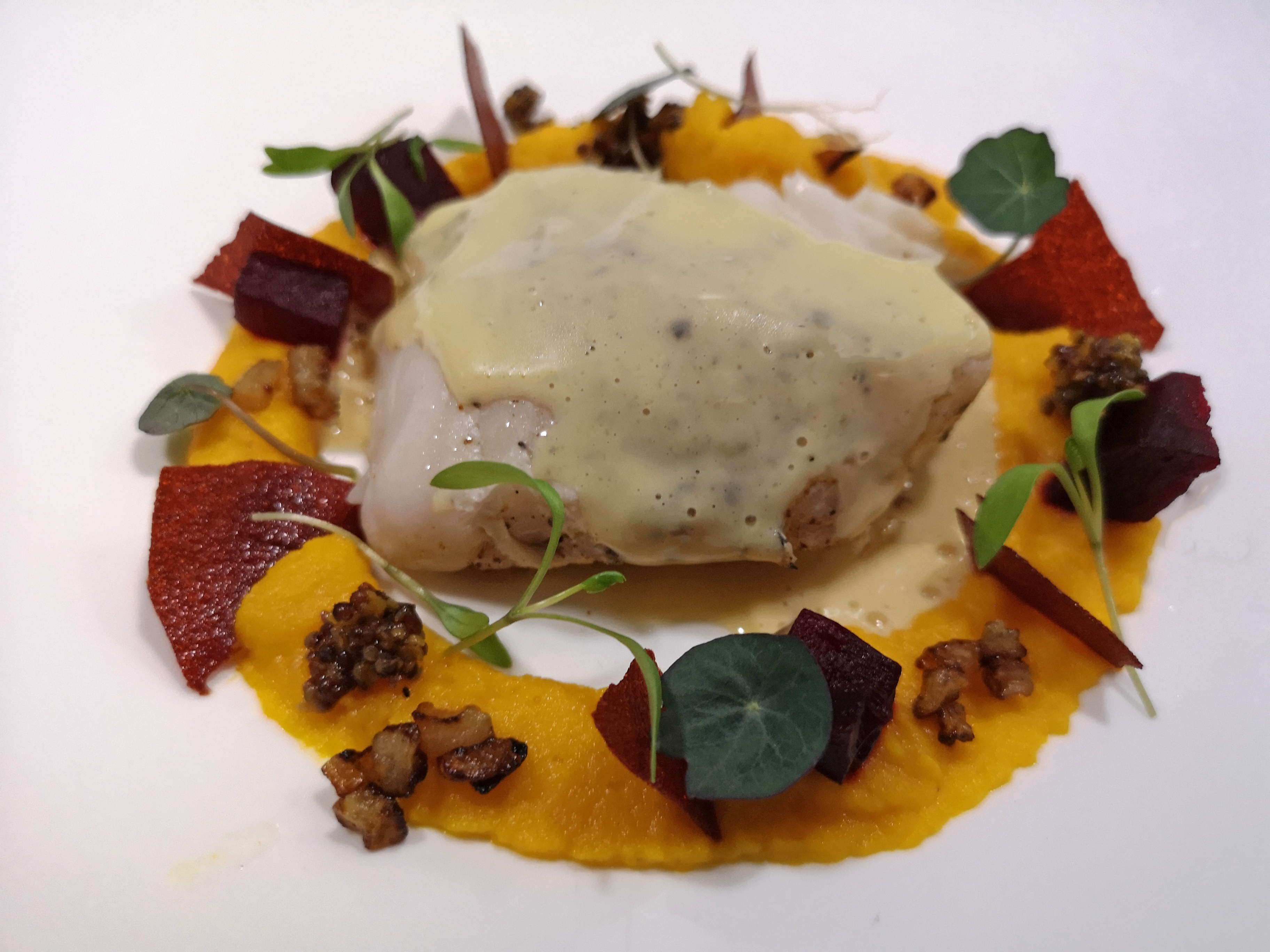 Maak een ring van wortelpuree met een doorsnee van 10-12 cm. Beleg de ring met blokjes biet, stukjes bietenvel, gebrande mosterdzaadjes en blaadjes cress. Leg een stuk heek midden in de ring met het vel naar boven. Lepel de beurre blanc rondom de vis.