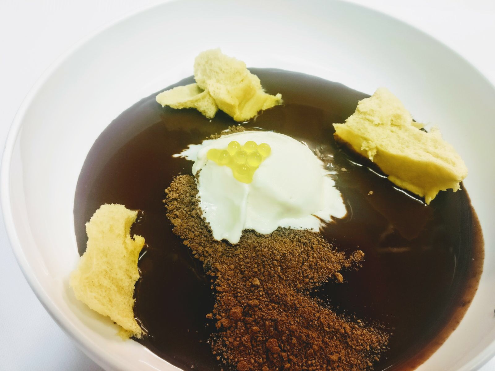 Lepel de hemelse modder in de borden. Verdeel wat cacao-aarde en stukjes spongecake over de borden. Leg een quenelle olijfoliesorbet midden op de borden en versier met enkele kaviaar bolletjes. Een hemelse afsluiting met deze friszoete Jerez-wijn van de moscateldruif. De wijn wordt gemaakt met het solera-systeem waarbij door middel van oversteken een constante kwaliteit wordt nagestreefd.