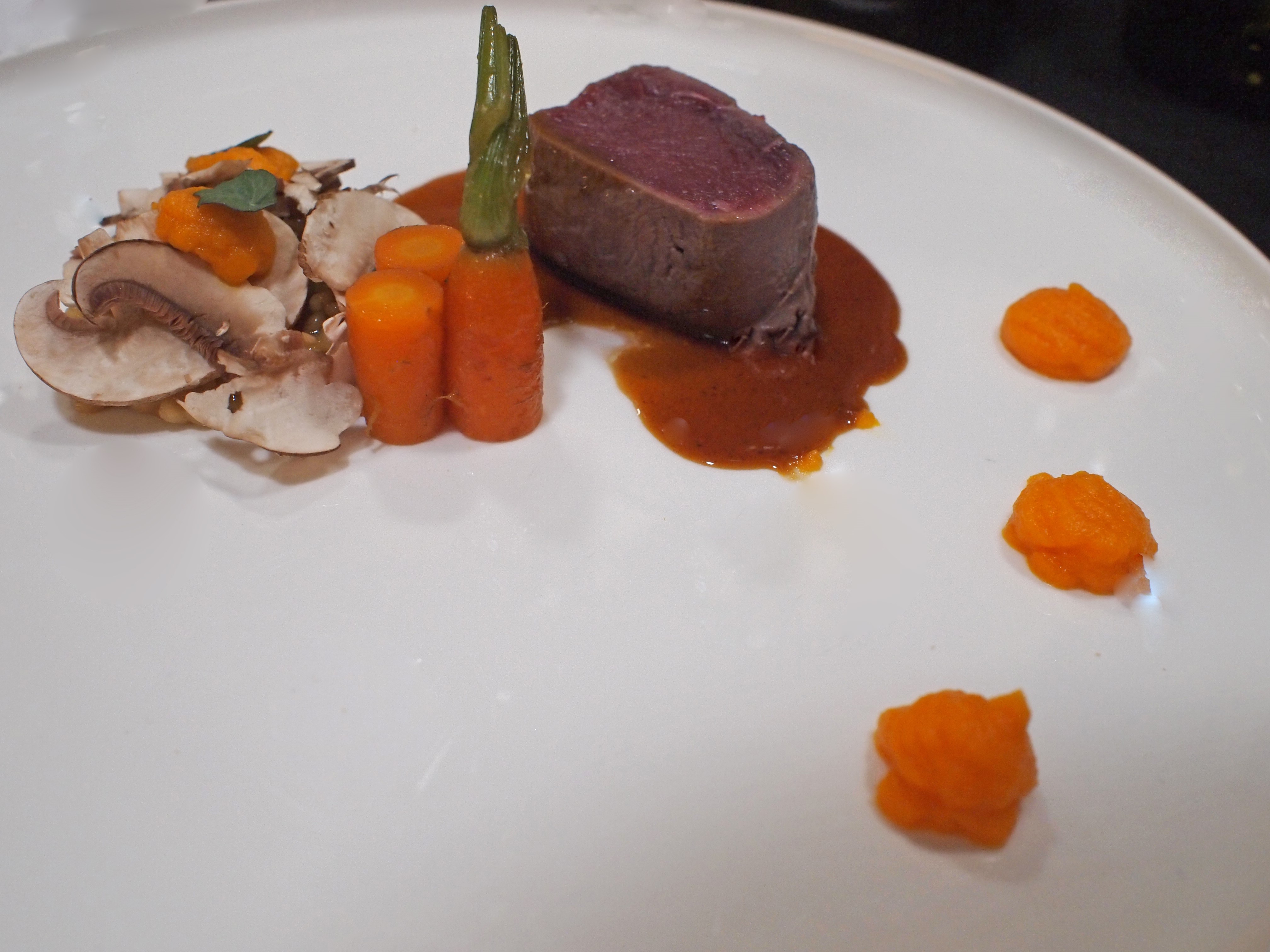 Leg een quenelle parelgort iets uit het midden van de borden. Bedek de parelgort dakpansgewijs met de plakjes champignon. Spuit toefjes wortelcrème op de plakjes champignon. Steek Zorri cress blaadjes in de wortelcrème. Snij de bospeen in drie gelijk stukken en schik ze staand naast de parelgort. Leg een plak hert aan de andere kant van het bord. Lepel wat saus tussenin en wat over het vlees.