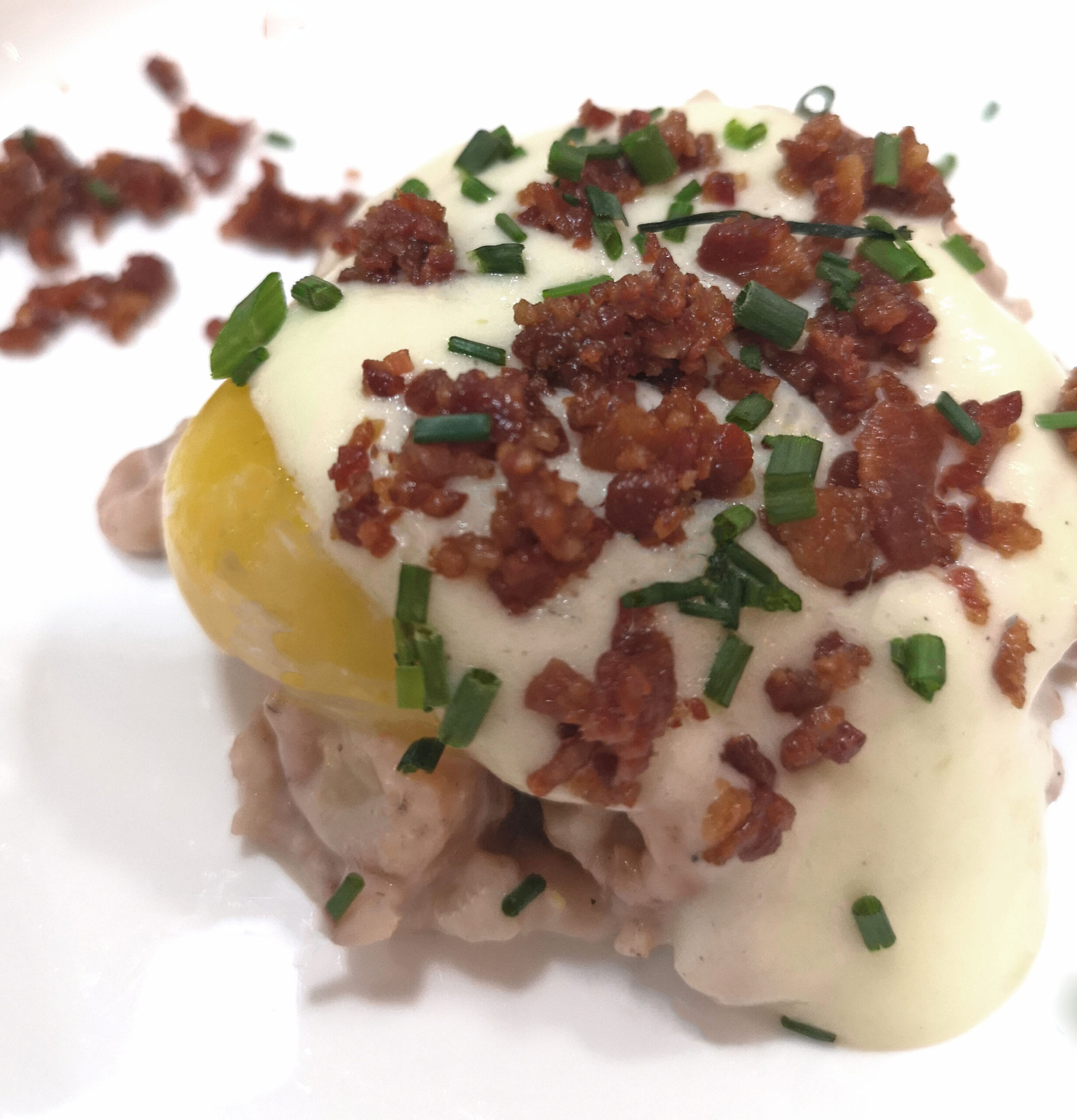 Verdeel de garnalen over de borden. Leg een dooier op de garnalen. Spuit brandade over het geheel. Sprenkel wat spekkruim over de brandade.