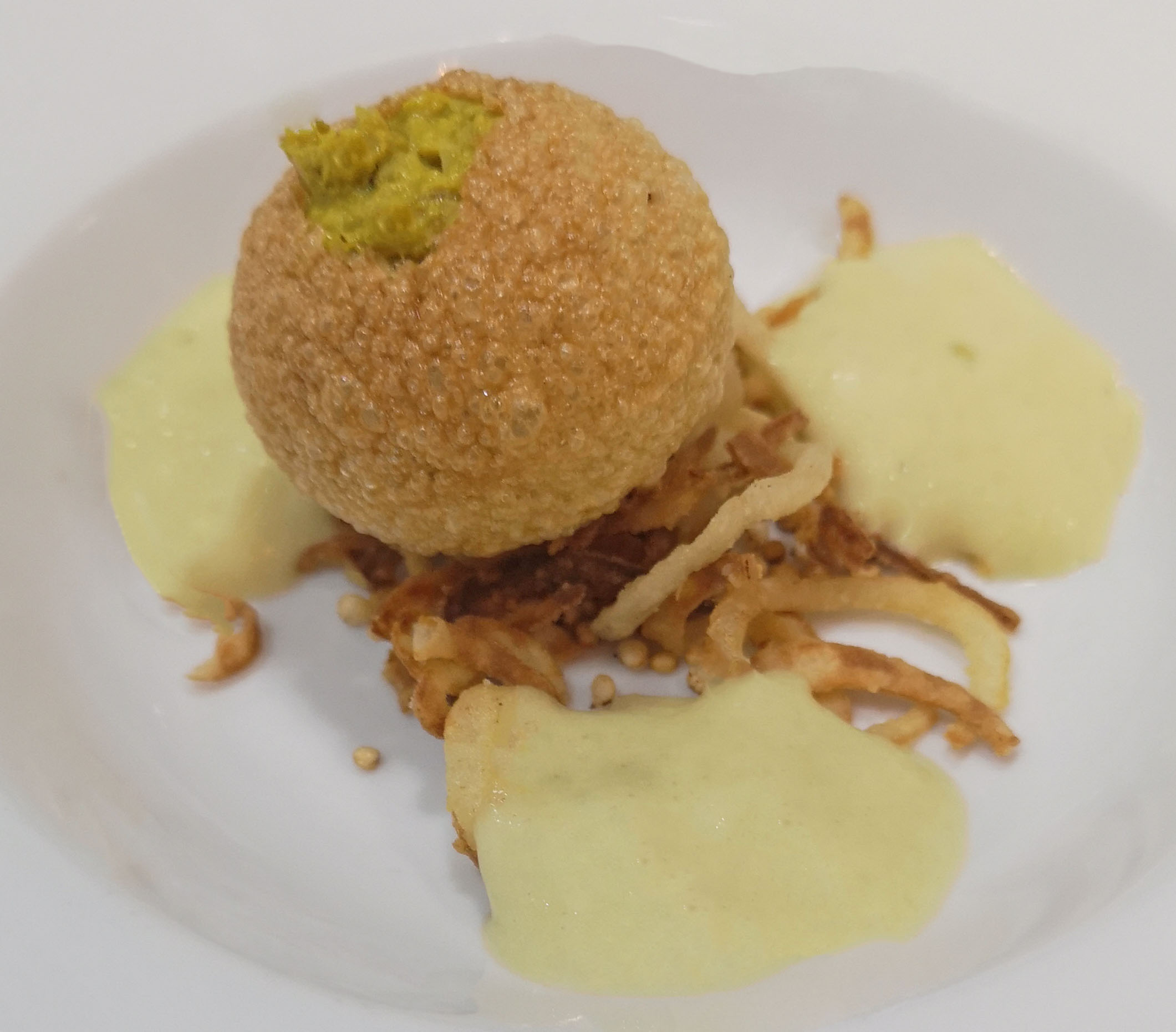Leg een bedje krokante uien/quinoa op de borden. Lepel de prei coulis rondom. Vul de pani puri met rendang leg ze op het bord en serveer meteen.