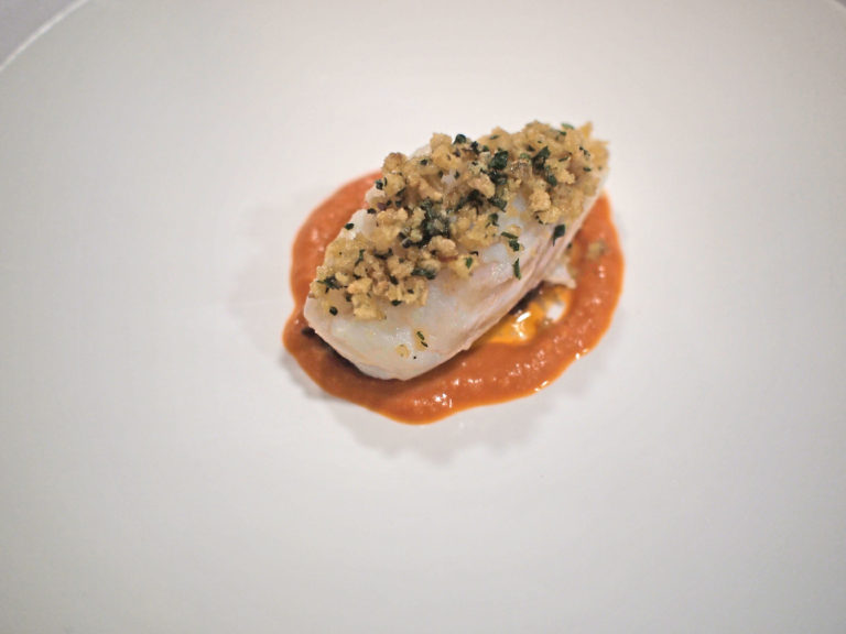 Verdeel het broodkruim over de stukken vis. Leg een eetlepel pesto midden op de borden. Leg hierop een stuk kabeljauw. Lepel de saus rondom.