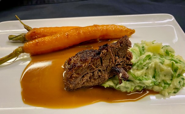 Verdeel de stamppot over de borden met daarop een stuk vlees. Plaats de wortels rondom en lepel saus en bakvocht van de wortels om het geheel.
