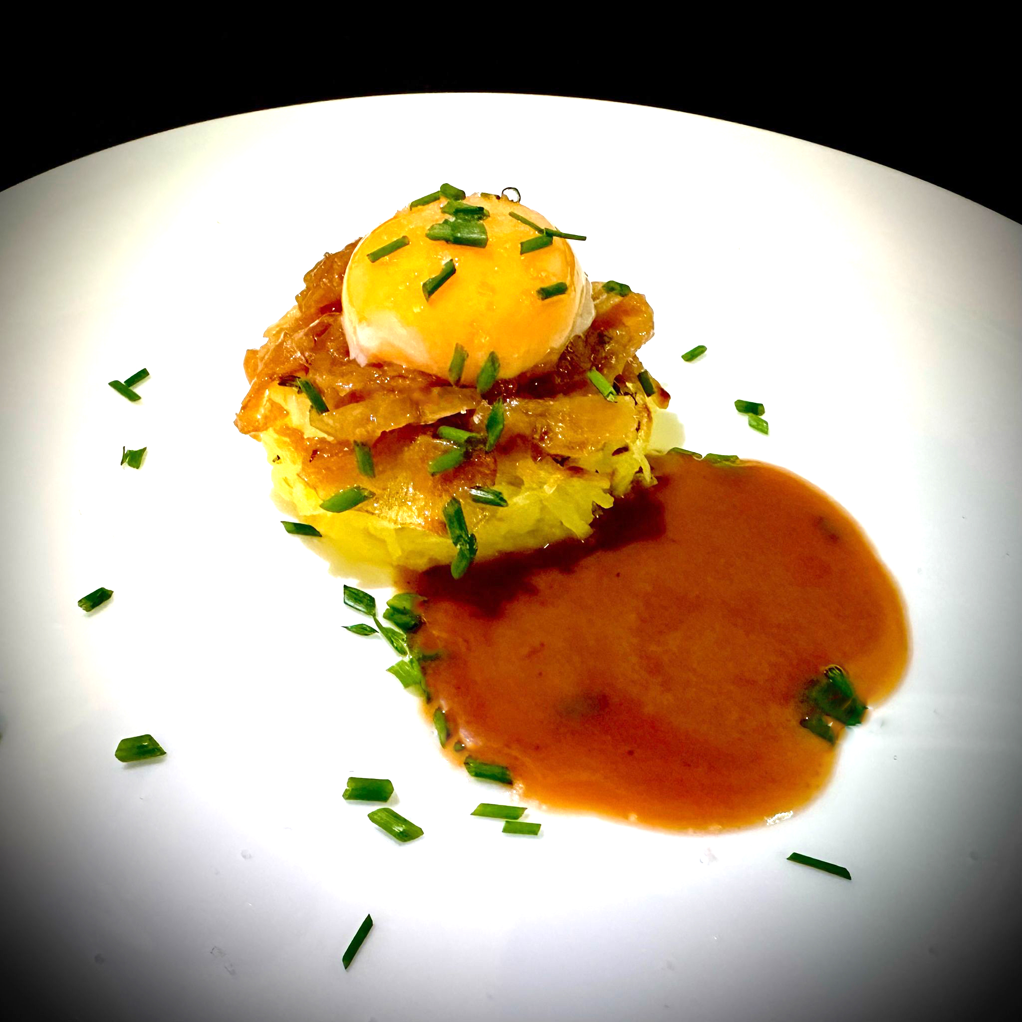 Leg op het bord. Lepel er wat uiencompote op en maak hierin een kuiltje.