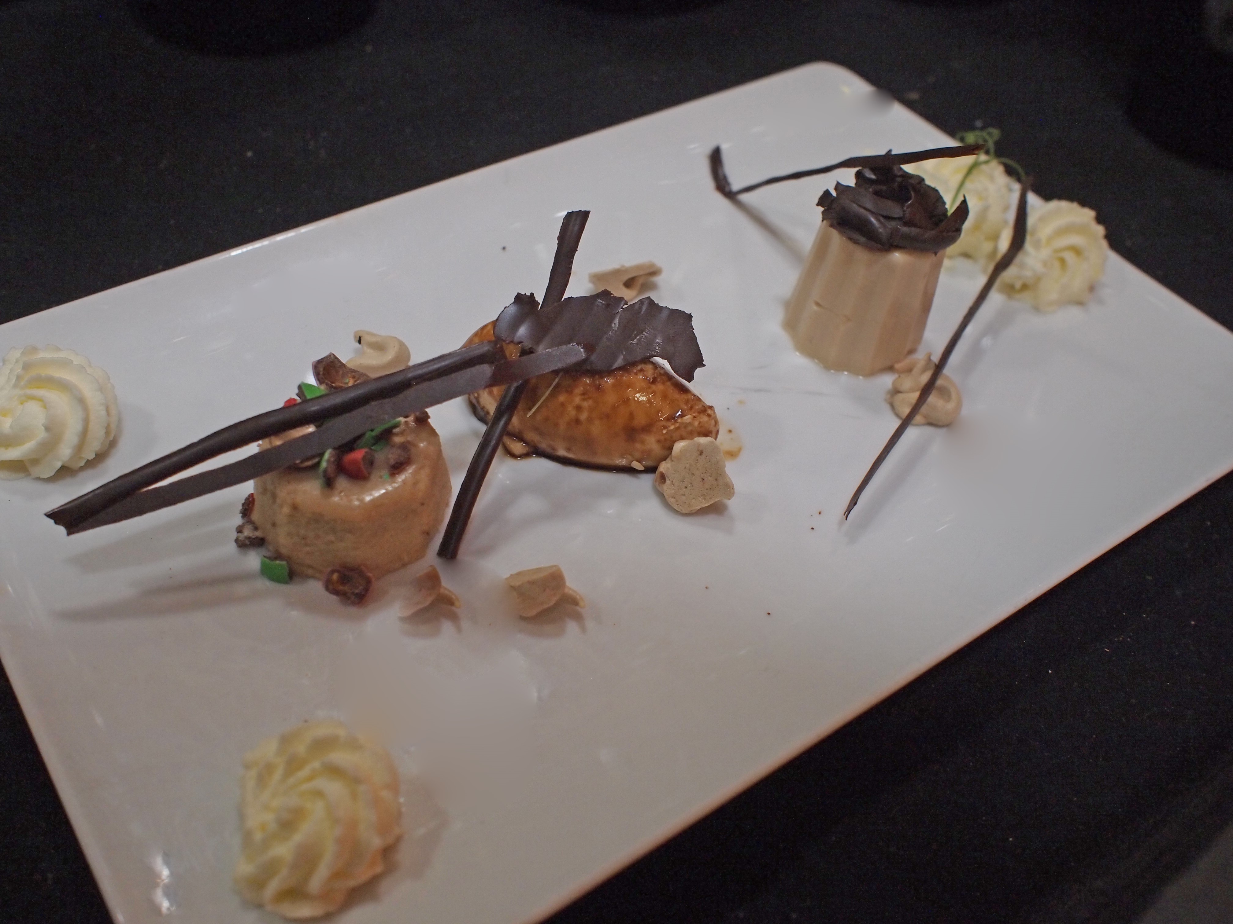Schik om en om blokjes mousse en crème in een lijn op de borden. Spuit toefjes crème brulée op en naast de blokjes. Decoreer het geheel met stukjes chocolade, schuimpjes en cress.