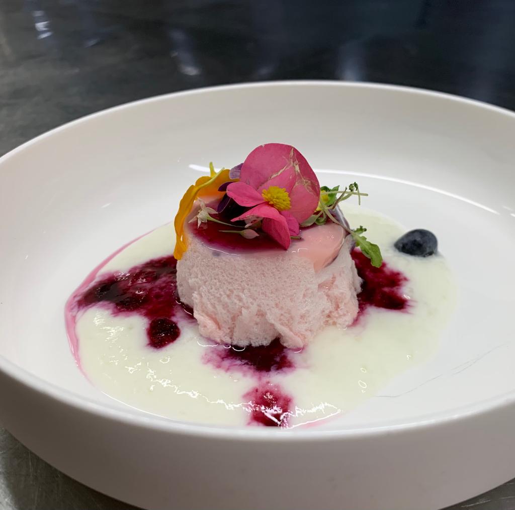 Lepel wat karnemelkcrème op de borden. Schenk wat bessenjus over de crème. Haal de merengue cakejes uit de vorm en plaats ze op de crème. Schenk weer wat jus over de cakejes. Versier met cress en bloempjes.