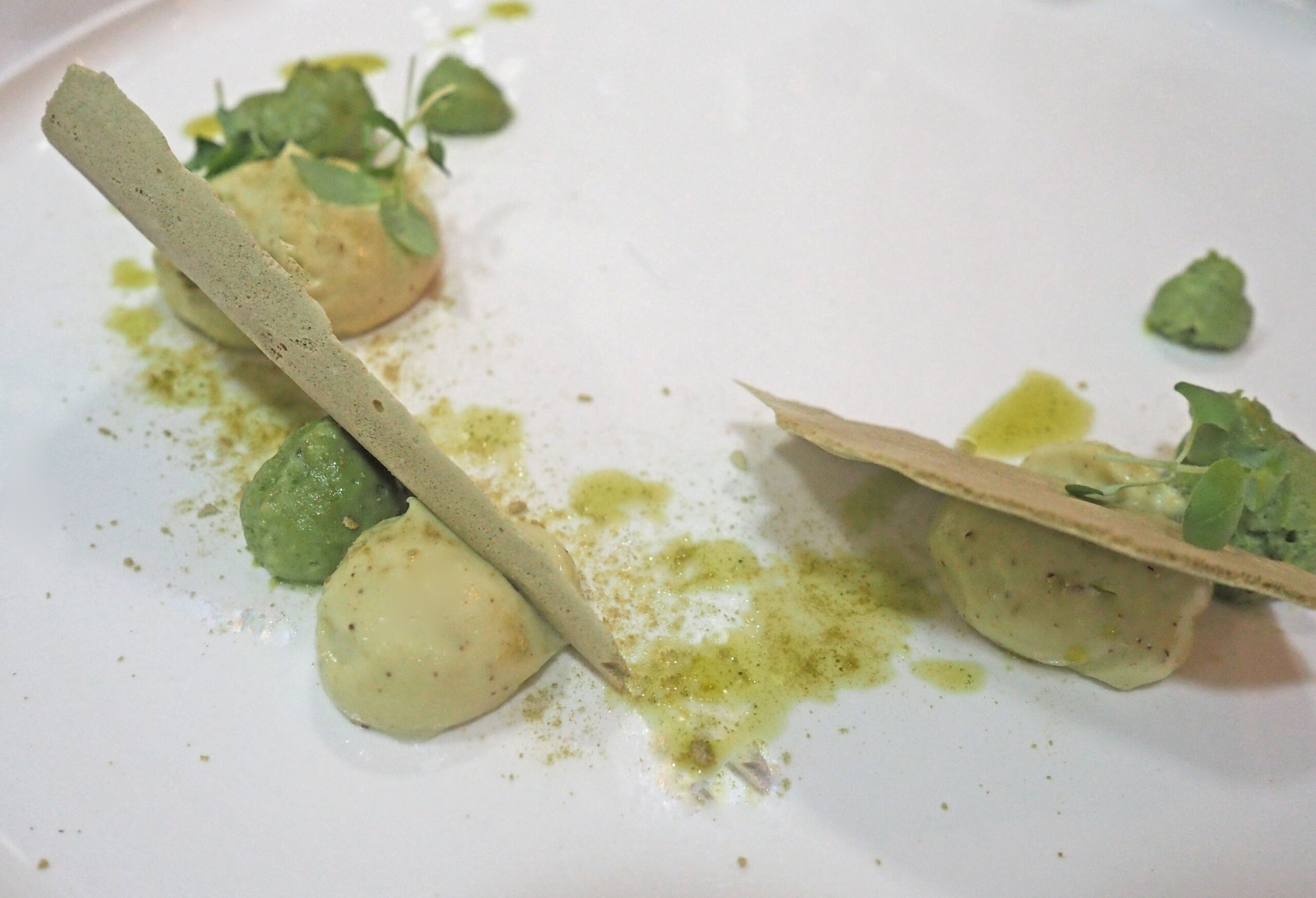 Spuit wat toefjes nameleka op de borden. Spuit toefjes kiwi espuma naast de nameleka. Versier met meringue, dragonolie en dragonblaadjes.