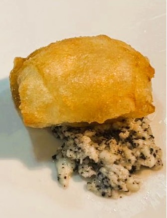 Vouw het deeg dicht en frituur in olie tot goudbruin (knijp tijdens het bakken met een kookpincet dicht).