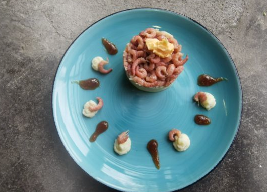 Pel de garnalen (of koop gepelde) en snij ze in tartaar. Breng op smaak met zout en peper.
