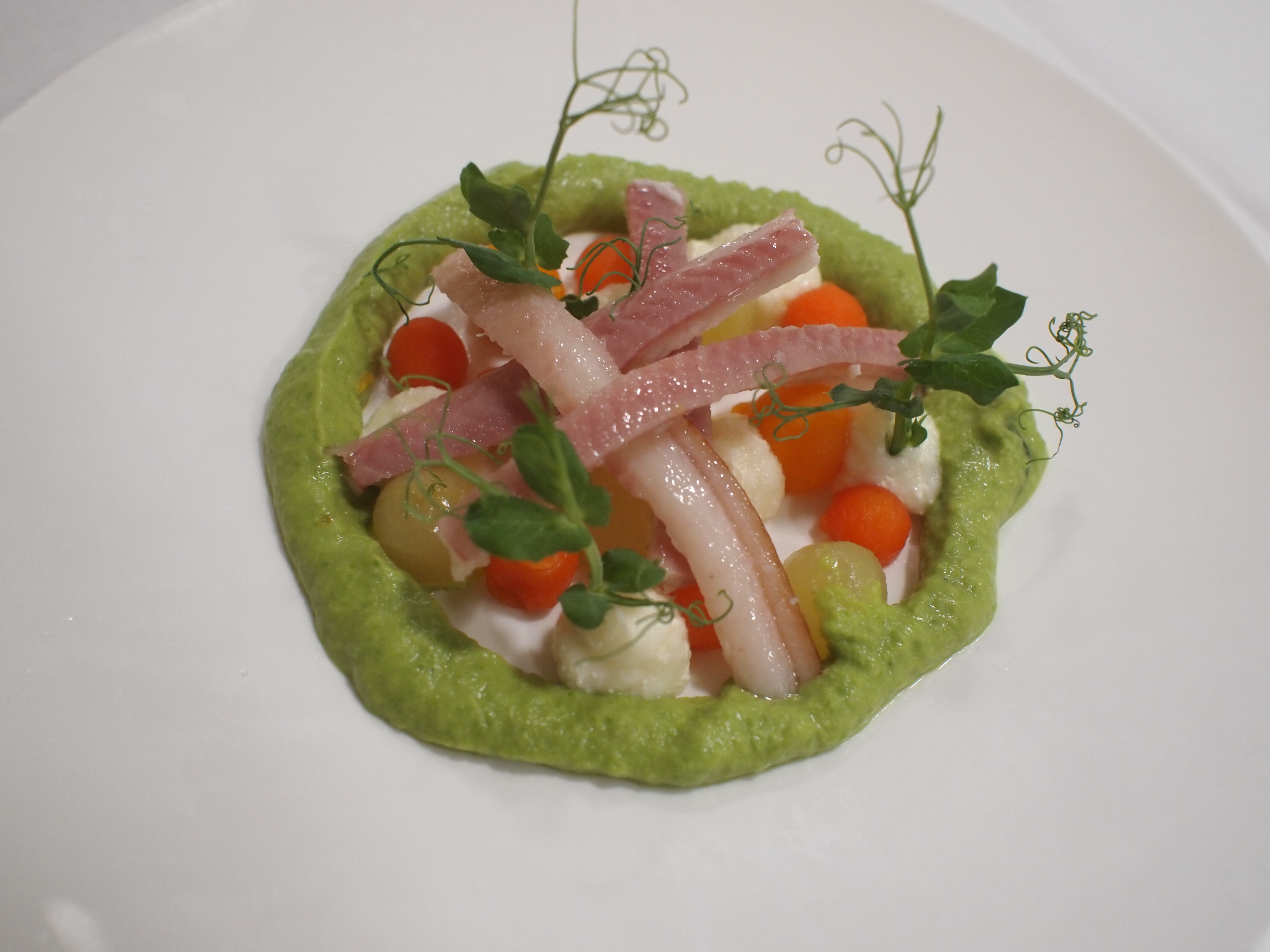 Spuit een ring van doperwtencrème van 12 cm op de borden. Vul de ringen met de bolletjes zoetzuur, paling en dotjes karnemelkgel. Lepel er een beetje marinade over en versier met Afilla cress.