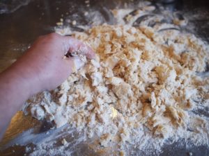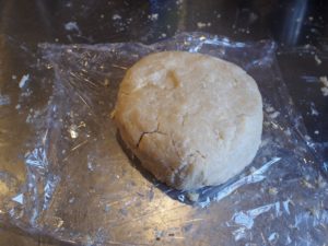 Hierin de in boter, ei en zout doen. Door het bloem kneden en vanaf de rand steeds bloem bijvoegen. Als er een bijna samenhangend geheel is melk toevoegen. Foto 1. Kort door kneden en in een plastic folie enkele uren in de koelkast laten rusten. Foto 2.