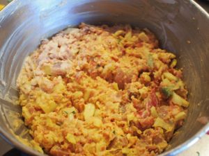 Maal de rest van het vlees in de gehaktmolen. Uien en knoflook fijn snijden. Kruidenblaadjes plukken en grof hakken.