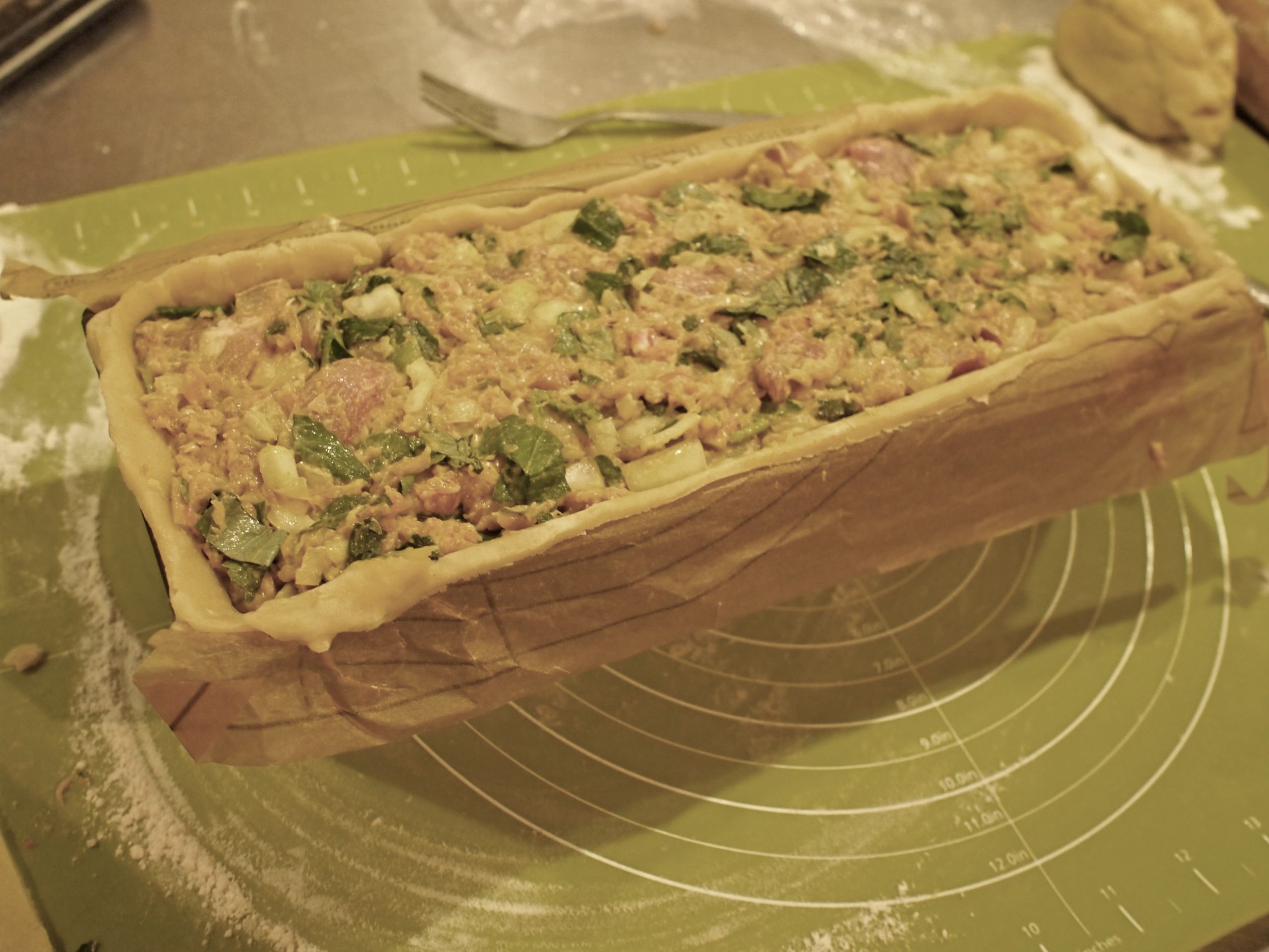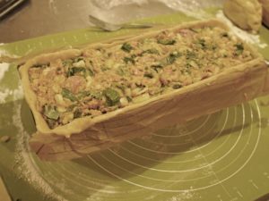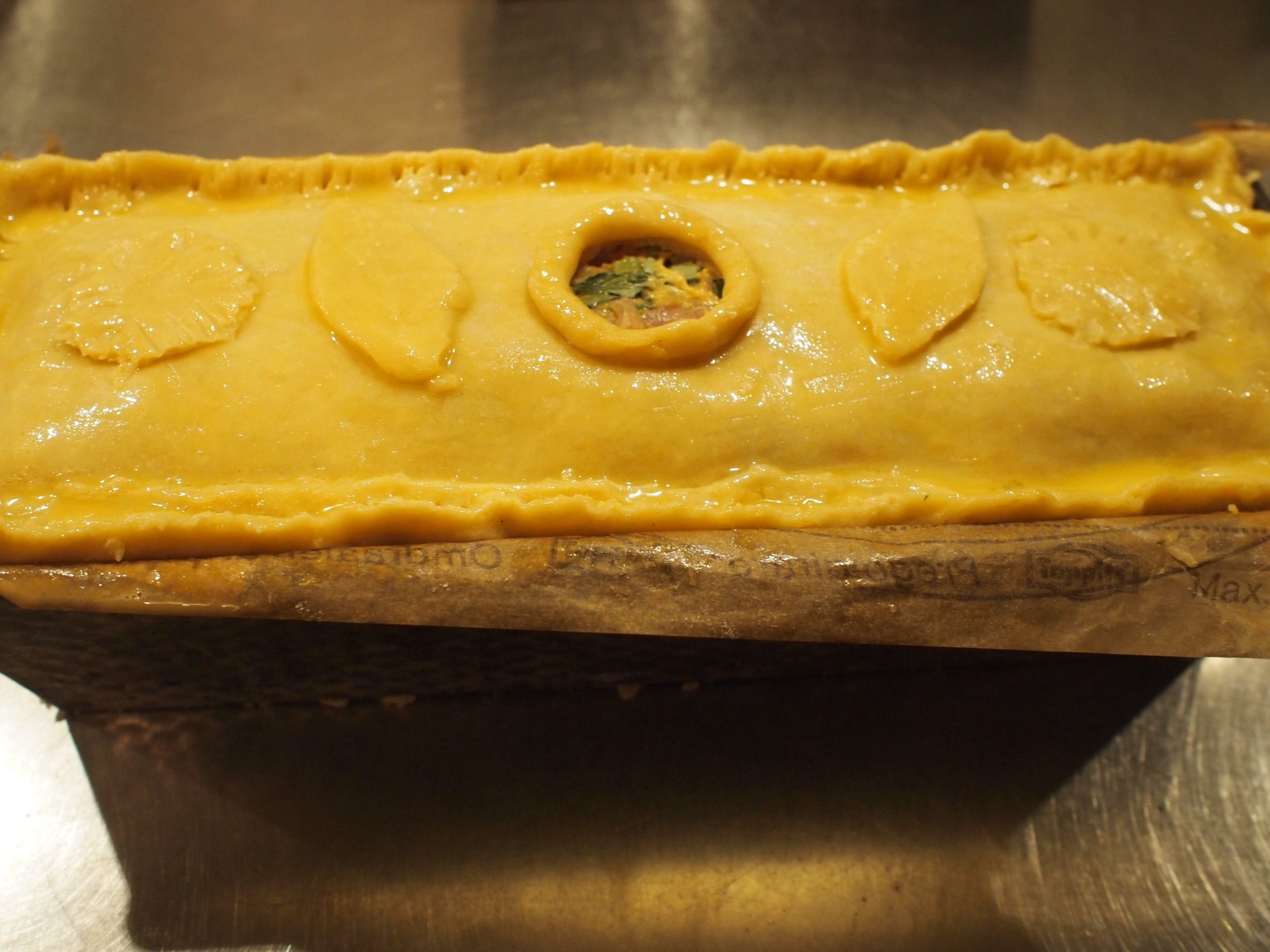Rol de rest van het deeg uit voor het deksel. Kneed dit goed dicht met het overhangende deeg. Maak met een uitstekertje een ‘schoorsteentje’ in de bovenkant van het deeg. Versier het deeg met de deegrestjes. Strijk af met losgeklopt ei. Foto 5