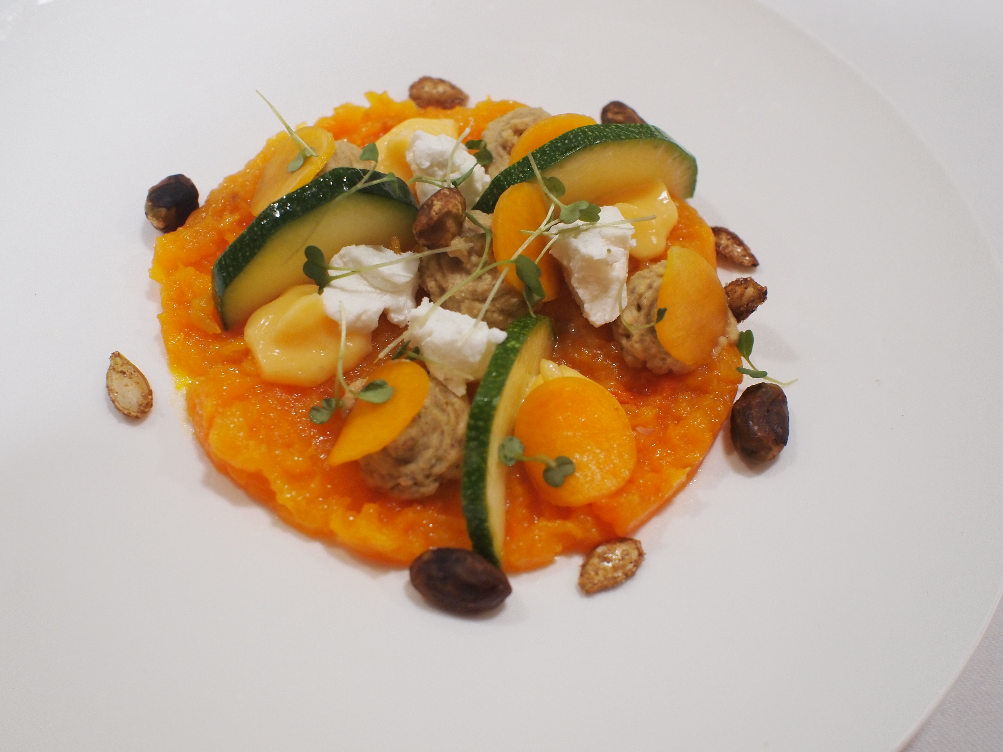 Verdeel de gepofte pompoen over de borden. Spuit dotjes curryen pistachecrème over de borden. Versier het geheel met pistachenootjes, pompoenrondjes, courgetteplakjes, stukjes