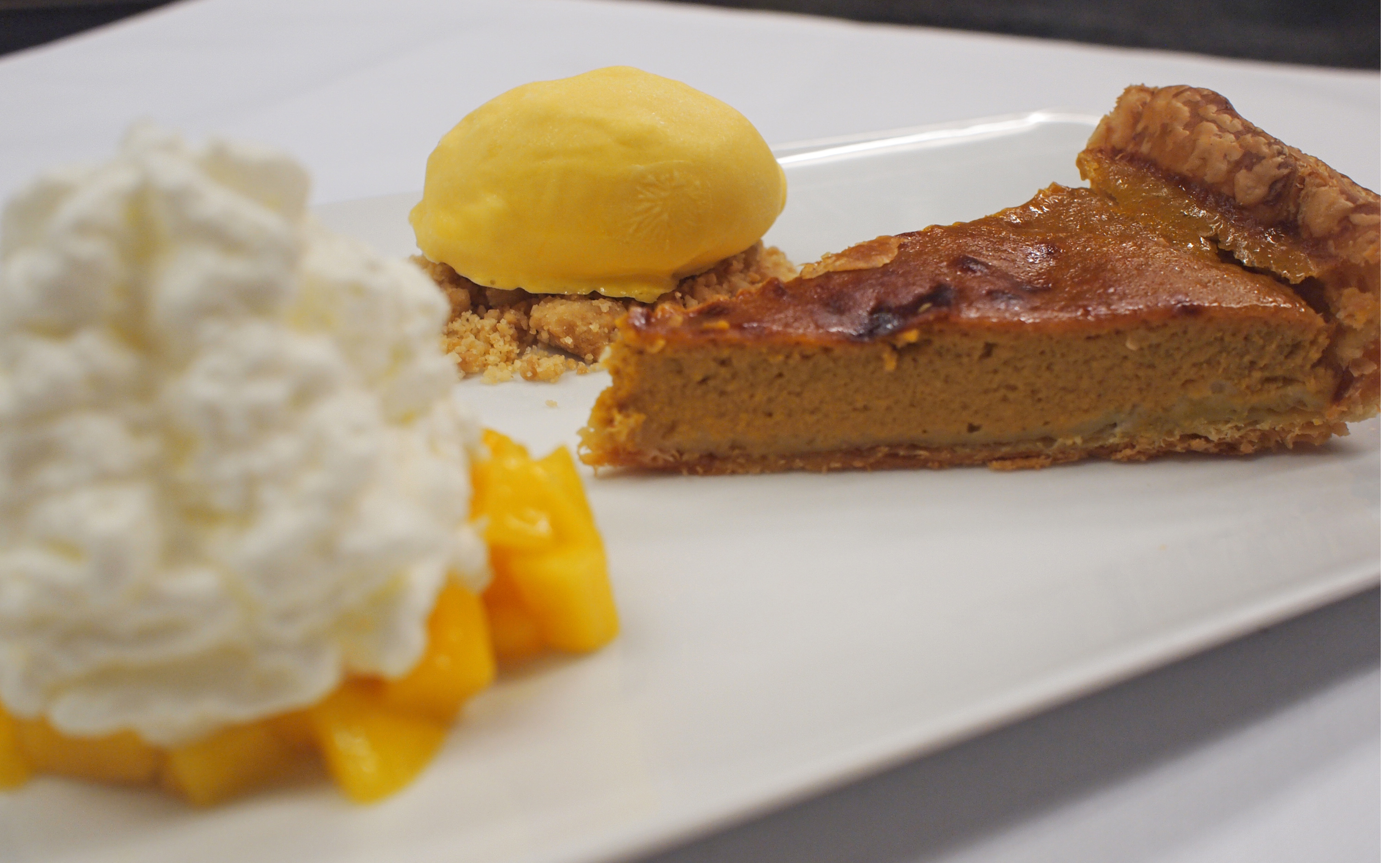 Snij de mango’s in kleine brunoise. Maak een rondje mango en een hoopje crumble op de borden. Spuit yoghurtschuim op de mango en plaats een bolletje sorbet op de crumble. Schik de pompoentaart op de borden.