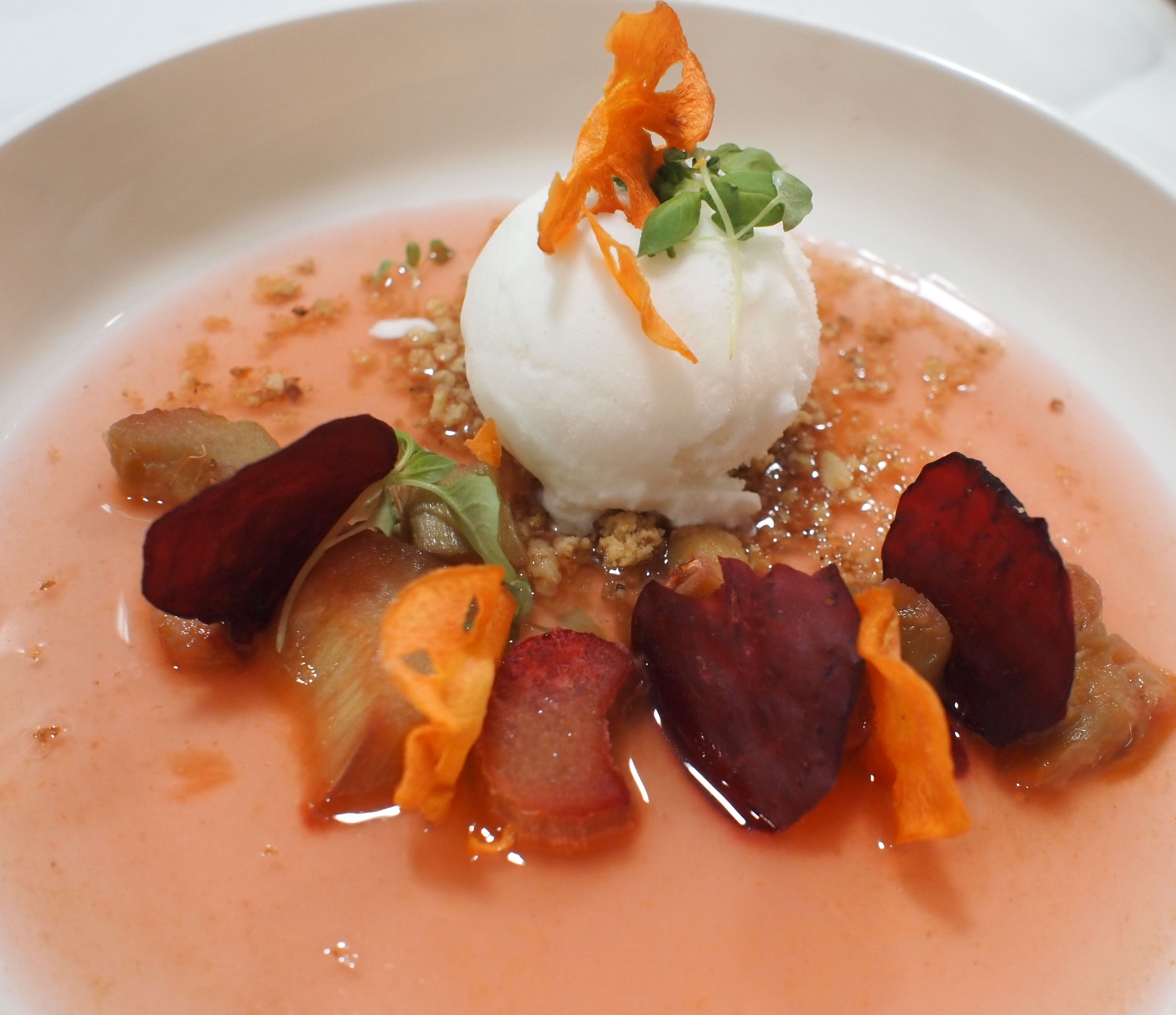 Verdeel de crumble in hoopjes over de borden. Verdeel hiernaast de stukken warme rabarber. Leg een quenelle yoghurtijs op de crumble en steek er wat limon cress in. Schenk de saus rondom en versier met bietenplakjes.