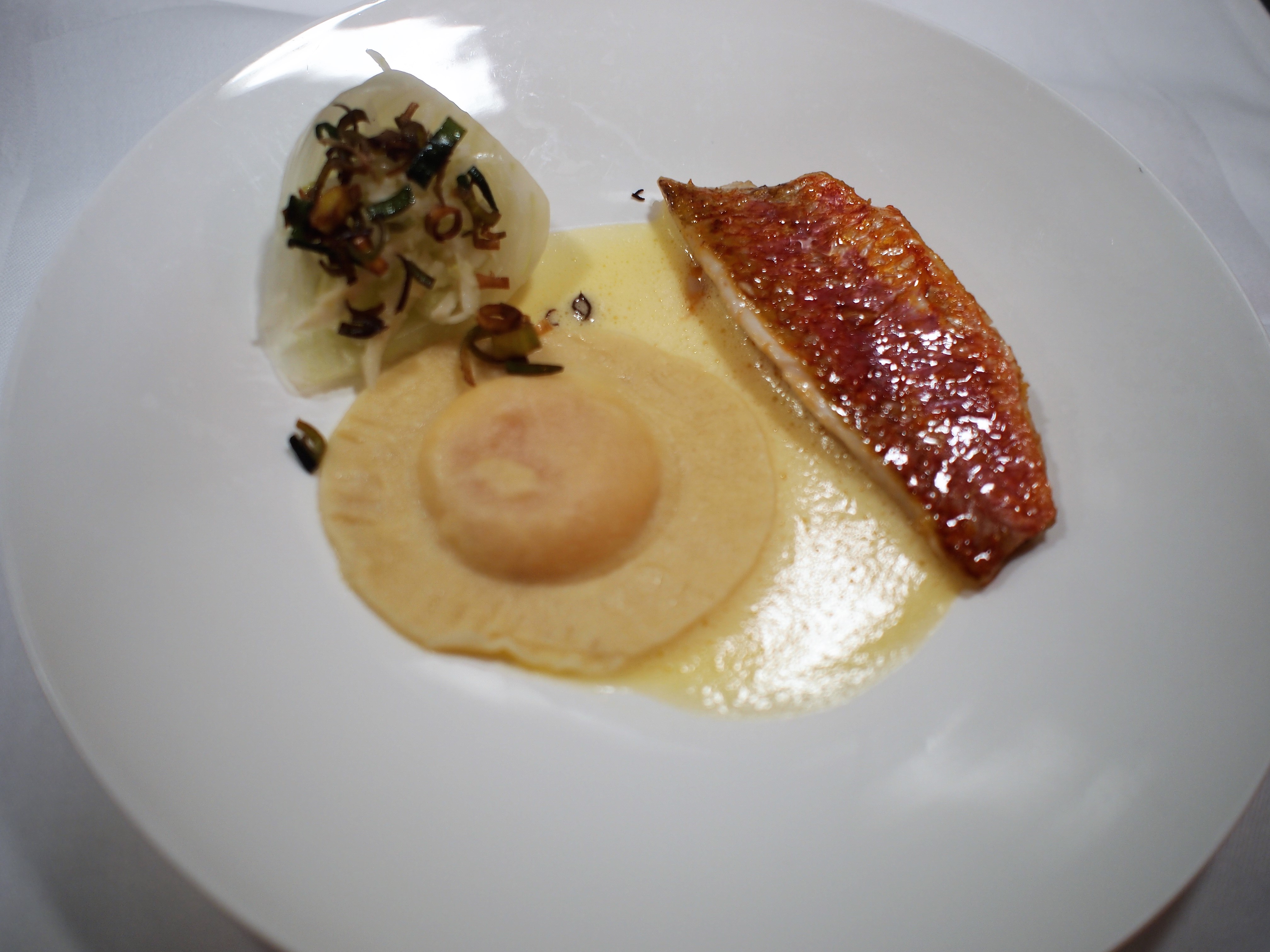 Ravioli 3 minuten zacht koken/pocheren. Uit de pan en droogdeppen op een doek. Frituur de prei-julienne. Maak een minisalade van venkel in de venkelbootjes. Leg de saus op het bord en maak een patroon. Leg de mul op het bord. Eventueel beetje Maldon. Leg de ravioli op het bord. Afmaken met de venkel en prei.