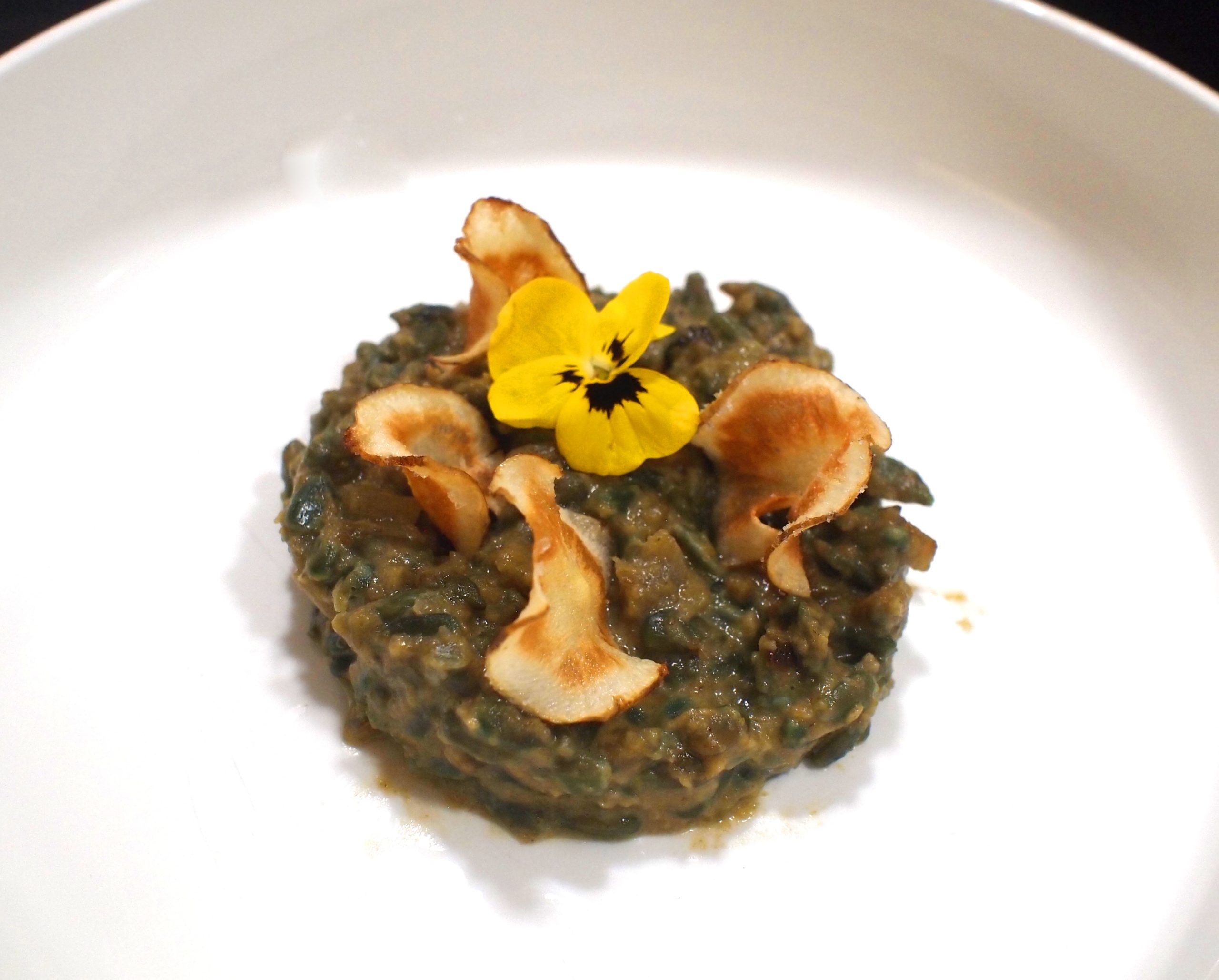 Verdeel de risotto over de borden. Steek wat aardpeerchips en pompoenrondjes in de risotto en versier met bloemetjes.