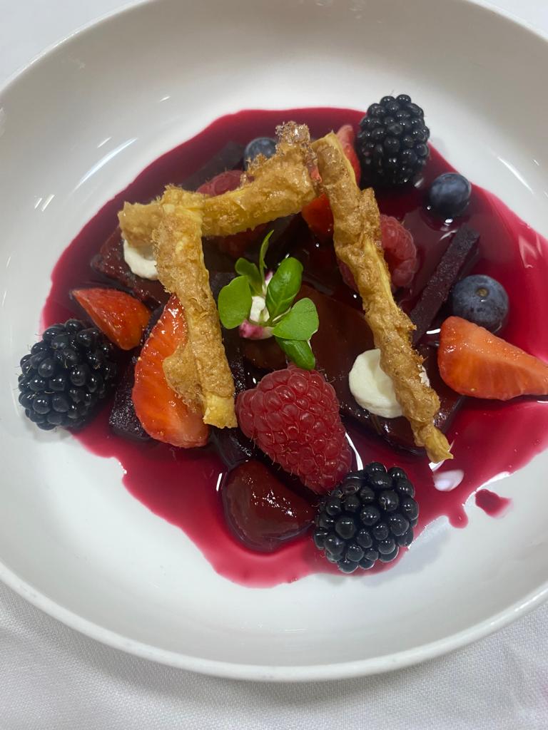 Ontpit de kersen en halveer ze. Snijd de aardbeien in vieren. Neem de bietengelei uit de vorm en snijd er 15 rechthoekige plakken van. Leg een plak bietengelei midden op een bord. Verdeel het fruit en bietenstaafjes over de plakken. Leg enkele blaadjes basilicum cress boven op het geheel. Decoreer het bord met bietensaus, mascarpone en bladerdeegrepen.