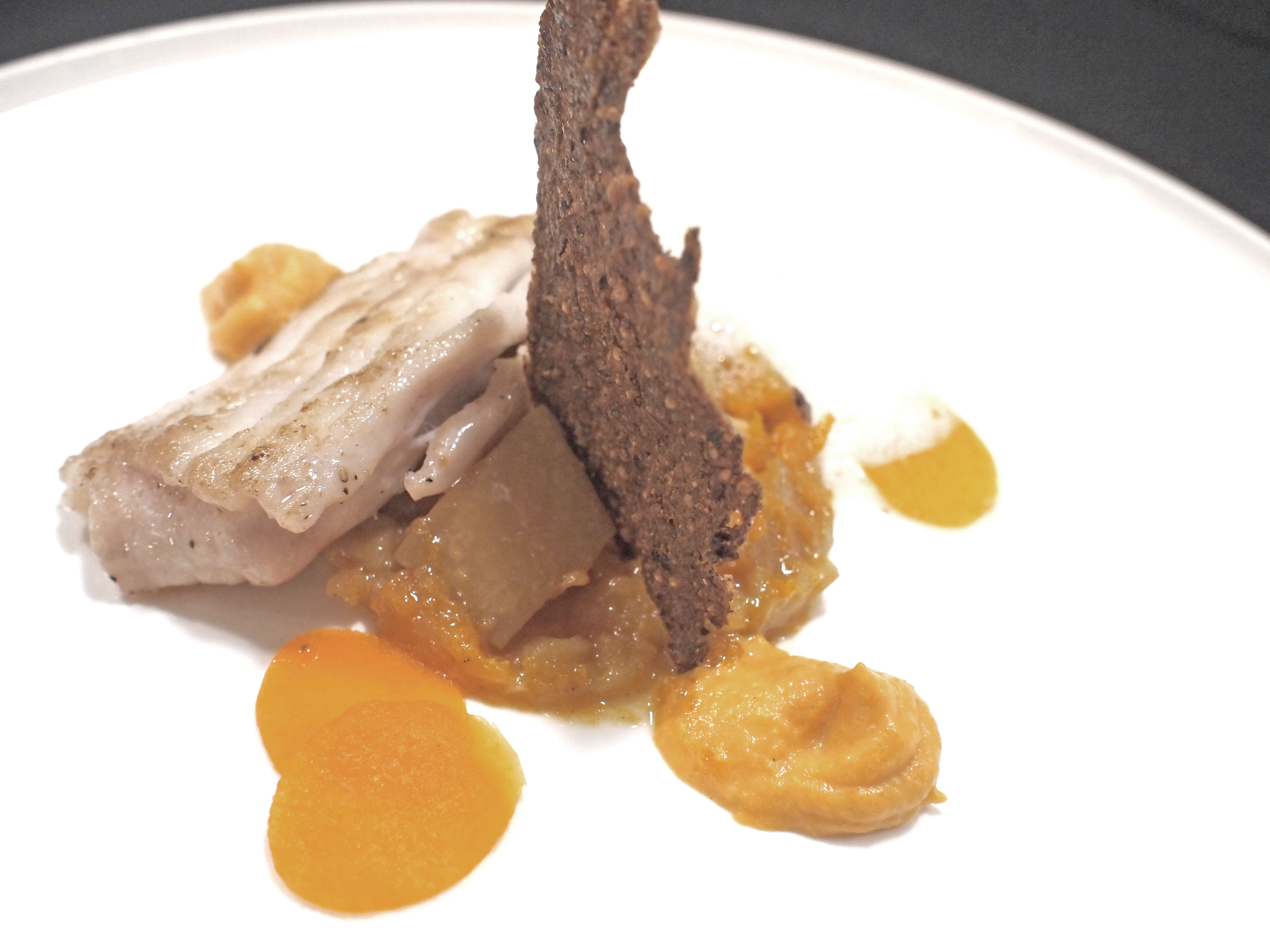 Maat een streep pompoencrème op de borden. Plaats een quenelle pompoencompote er tegenaan. Versier de crème met plakjes pompoen zoetzuur, komijnchips en shiso cress. Schik de rog hiernaast en lepel wat schuim naast de rog.