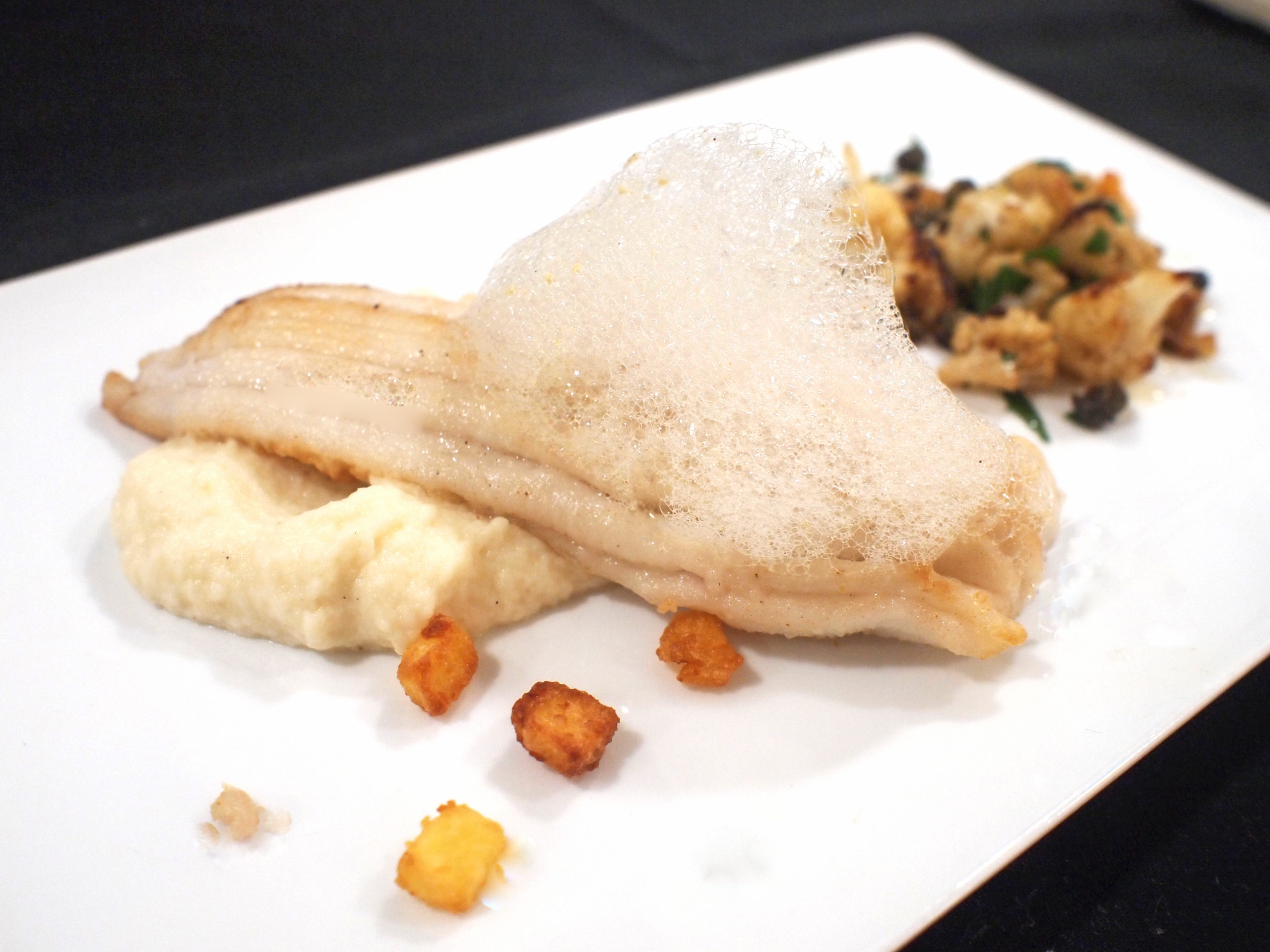 Leg een stuk rog op de borden en lepel de boter en kappertjes erover. Verdeel de bloemkool en knolselderij naast de rog. Strooi de aardappelkaantjes over het geheel en lepel wat schuim op de borden.