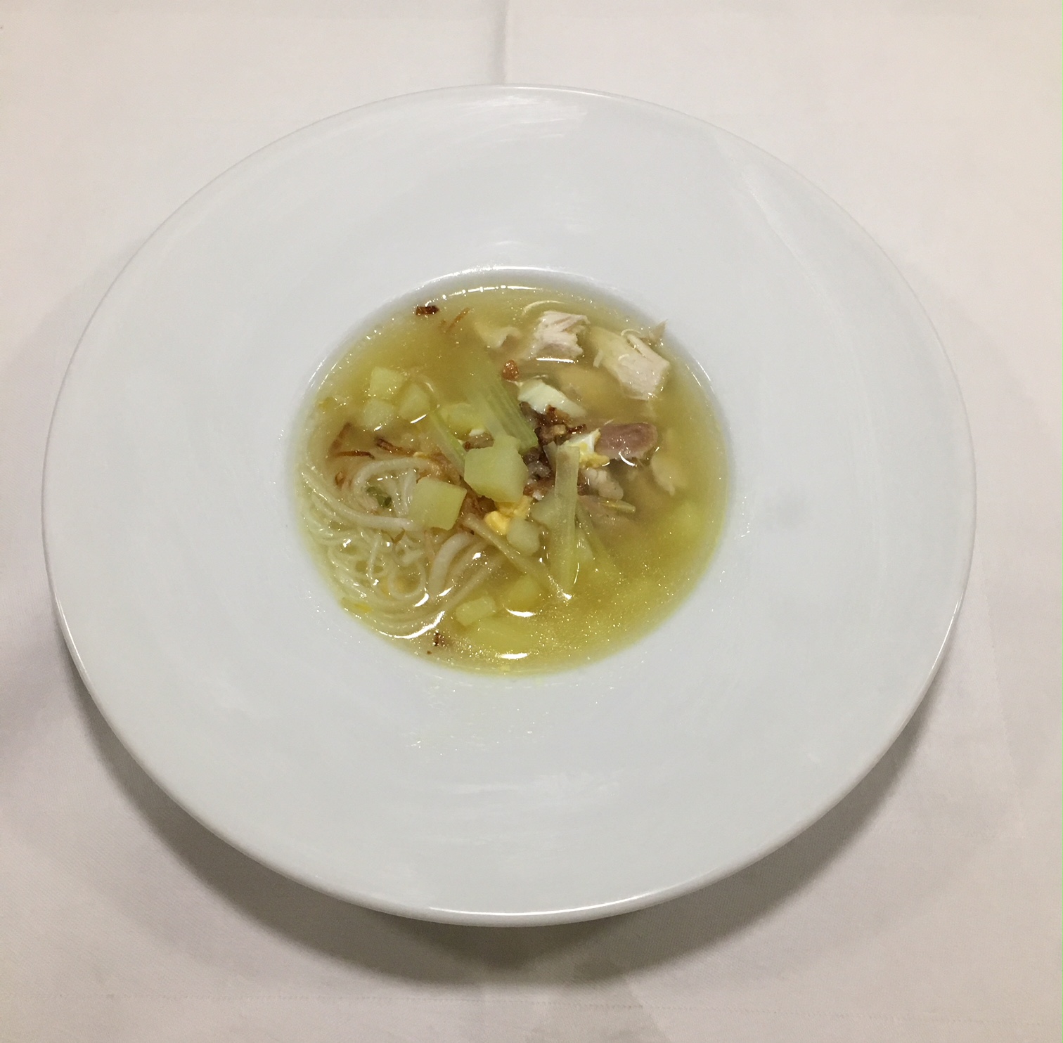 Snij de kippen in stukken. Trek bouillon van de kip met 3 liter water, peper, zout, gesneden knoflook en de ui. Laat een uur trekken, haal de kip eruit en snij het vlees in blokjes. Vijzel de kemirinoten tot een pasta. Snij alle groeten/kruiden fijn en voeg die met kemiripasta toe aan de bouillon en laat nog 30 minuten trekken. Zeef de soep en voeg het kippenvlees toe. Breng op smaak met citroensap en ketjap.