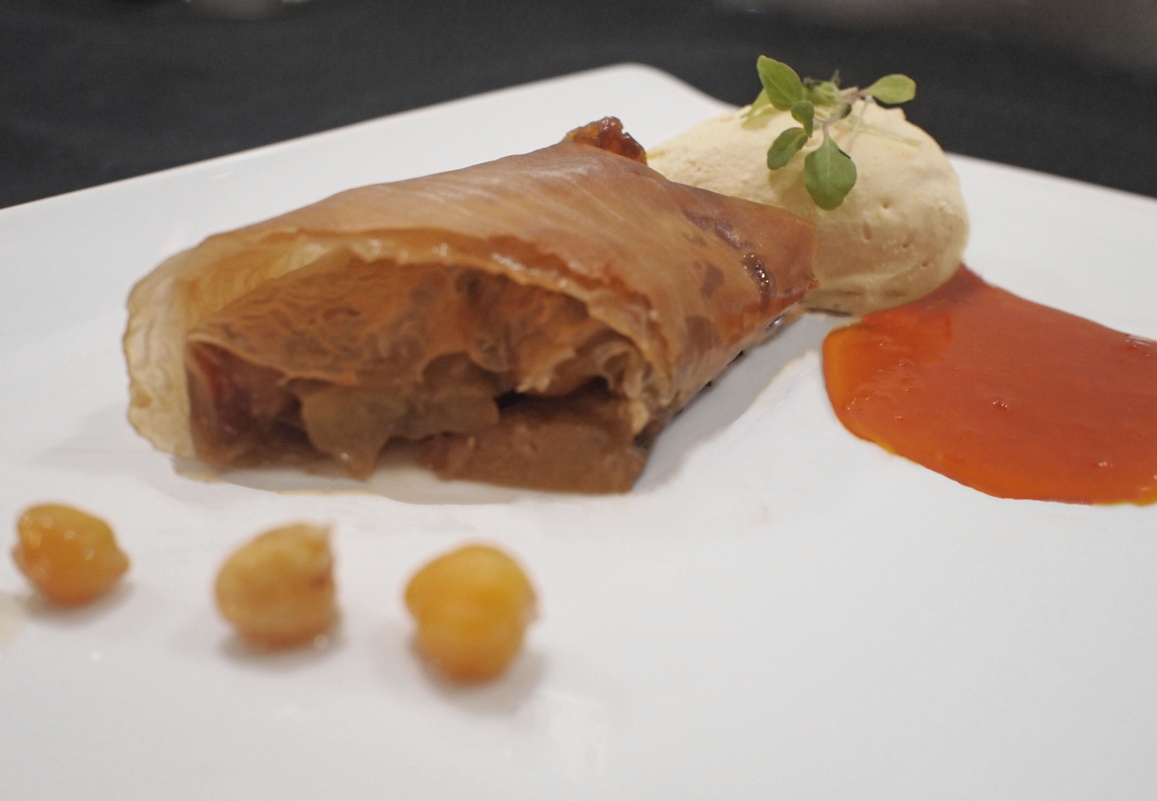 Verdeel de quenelles kikkererwtenijs over de borden. Leg de strudel ertegenaan. Verdeel de wortelsaus en kikkererwtenkaramel rondom. Versier met honny cress.