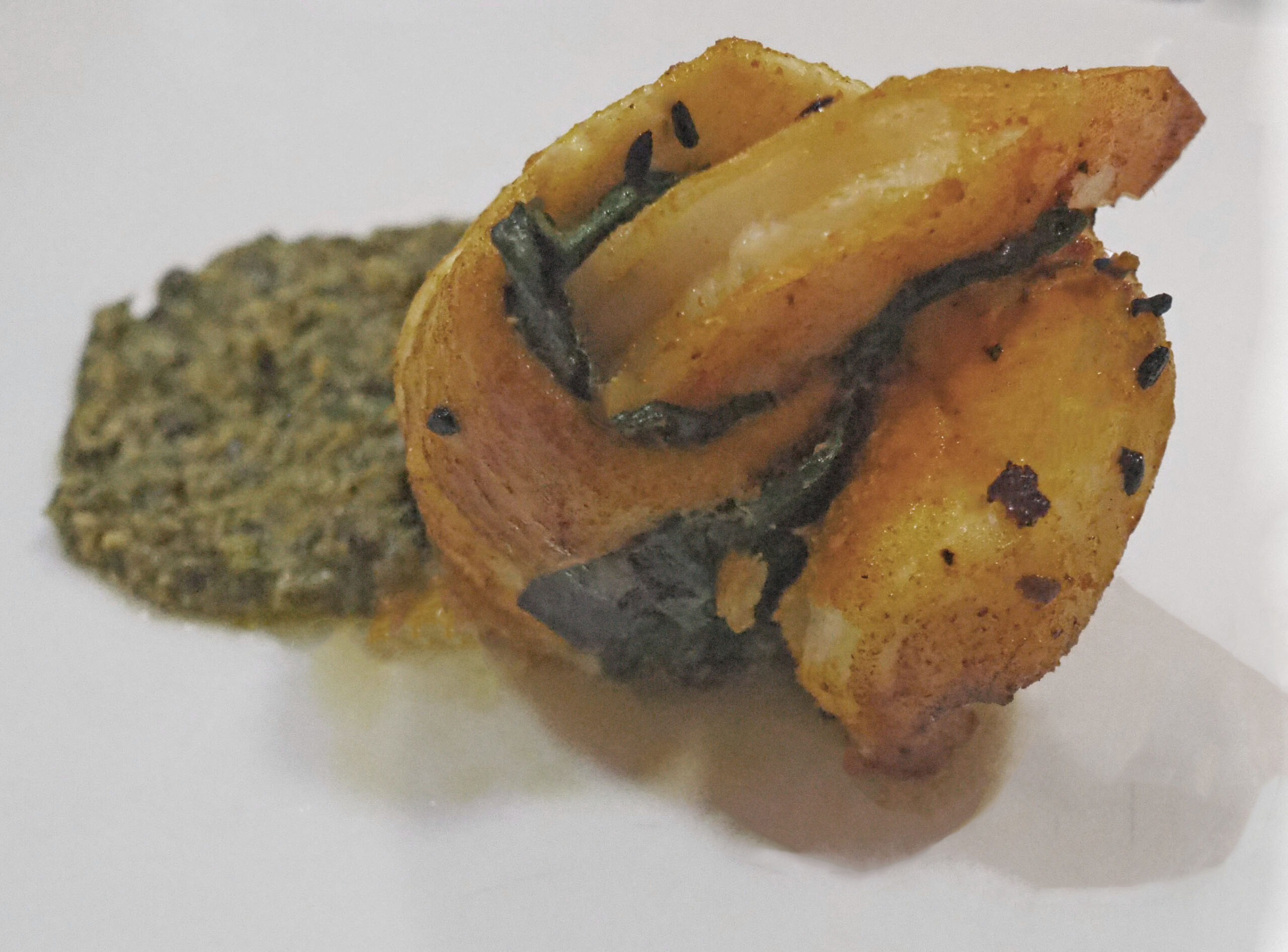 Fileer de tarbot en verwijder de huid. Wrijf de kurkuma en uienzaadjes in de filets en laat 15 minuten pekelen. Kruid de gamba’s met zout en een kleine beetje chilipeper. Dompel de spinazieblaadjes even in koken water en dep daarna droog. Leg een visfilet op de werkbank en bedek met blaadjes spinazie. Sprenkel iets garam masala over de spinazie. Leg een gamba op het dunne einde van de visfilet en rol strak op. Zet vast met een prikker. Herhaal voor alle filets.