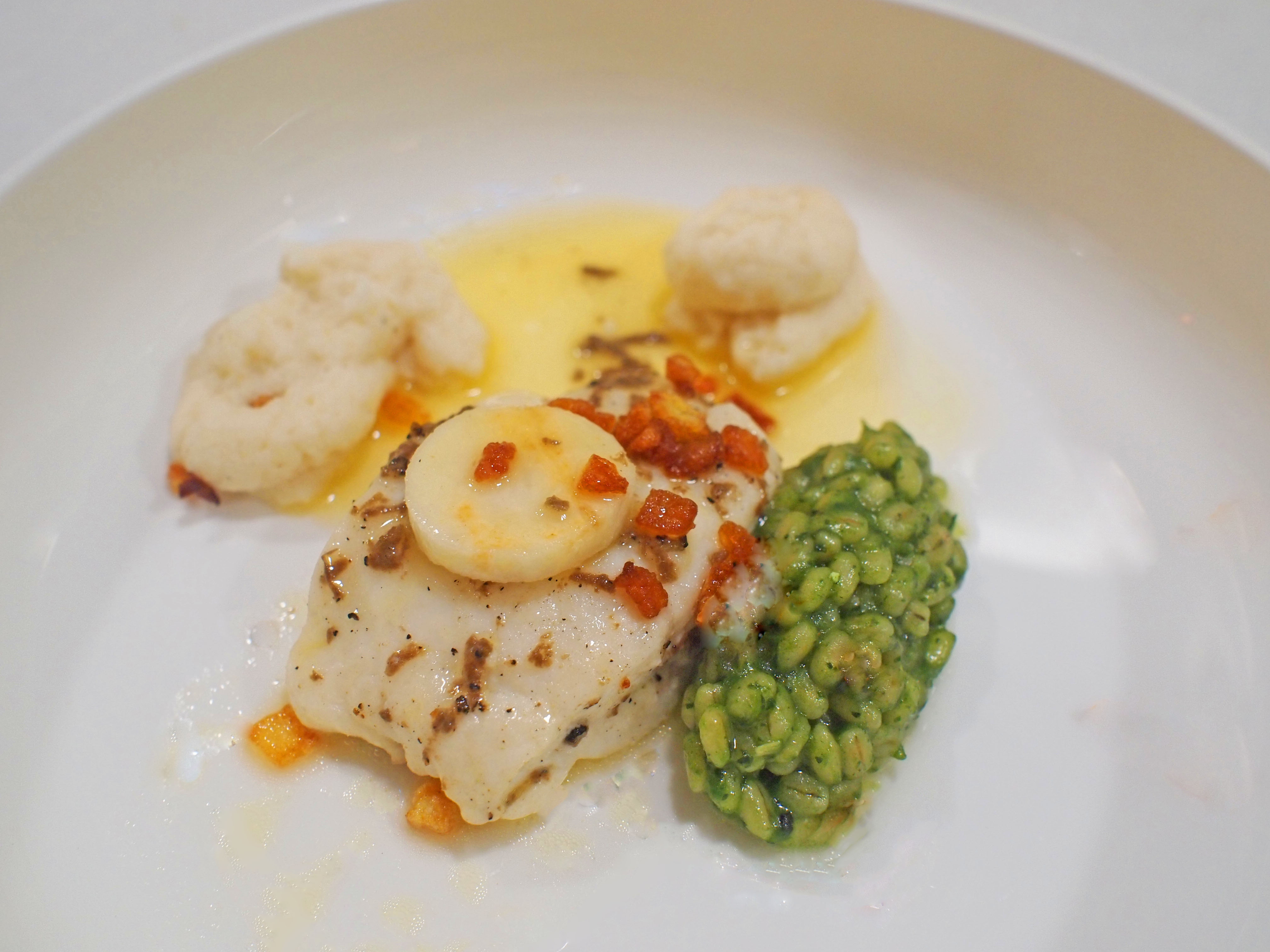 Leg een quenelle parelgort op de borden. Hiernaast en stuk tarbot. Lepel de saus over de vis. Spuit toefjes knolselderijmousseline op de borden. Versier de borden met plakjes knolselderij en aardappelkaantjes. Decoreer met tuinkers