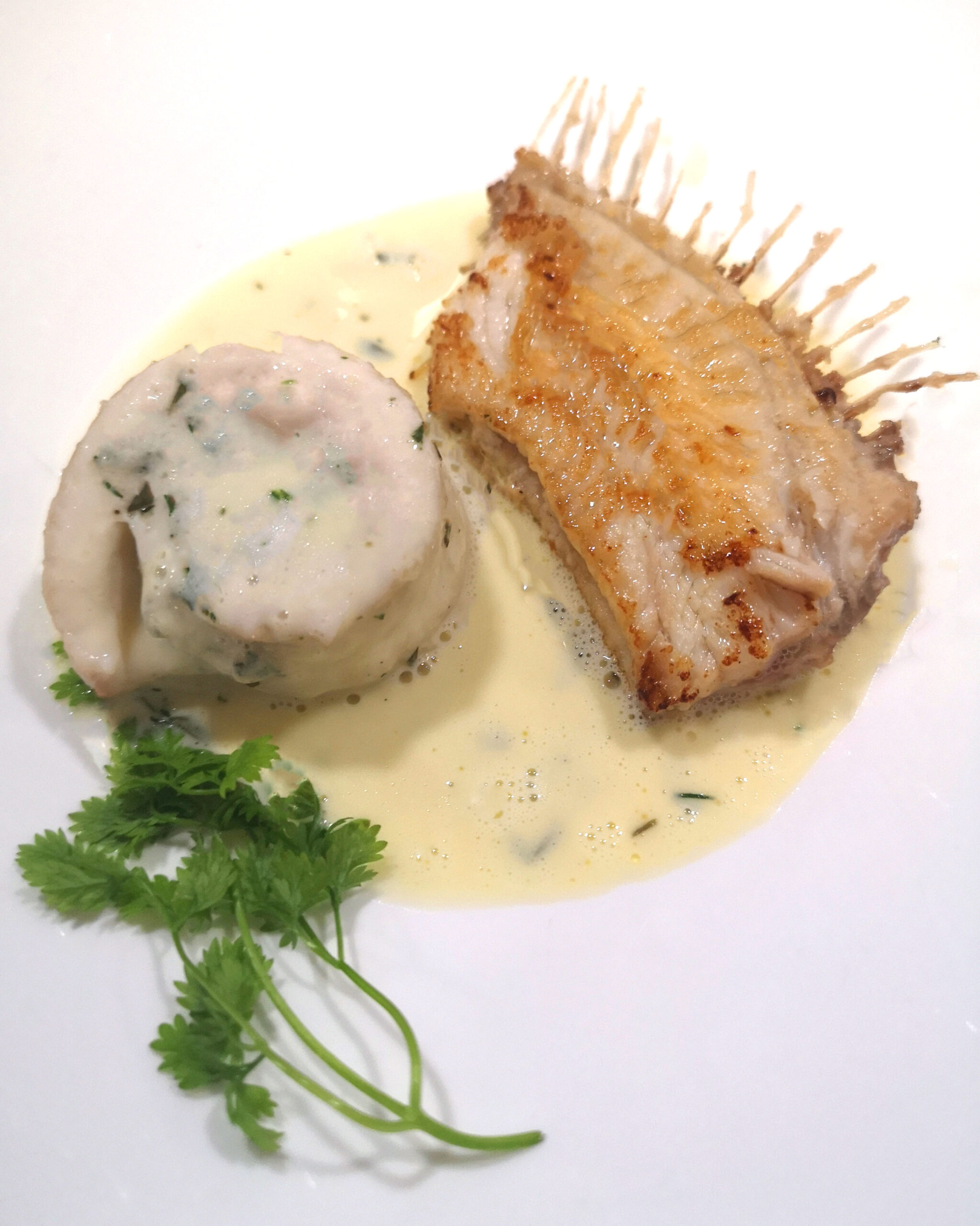 Leg de filets op een stuk plasticfolie. Smeer de farce op de filets aan de graatkant. Rol de filets op te beginnen met de dunne kant. Leg de filets op een met olijfolie ingesmeerde gastroplaat. Stoom de filets gaar in 10-12 minuten in een combi-stoomoven van 70°C.