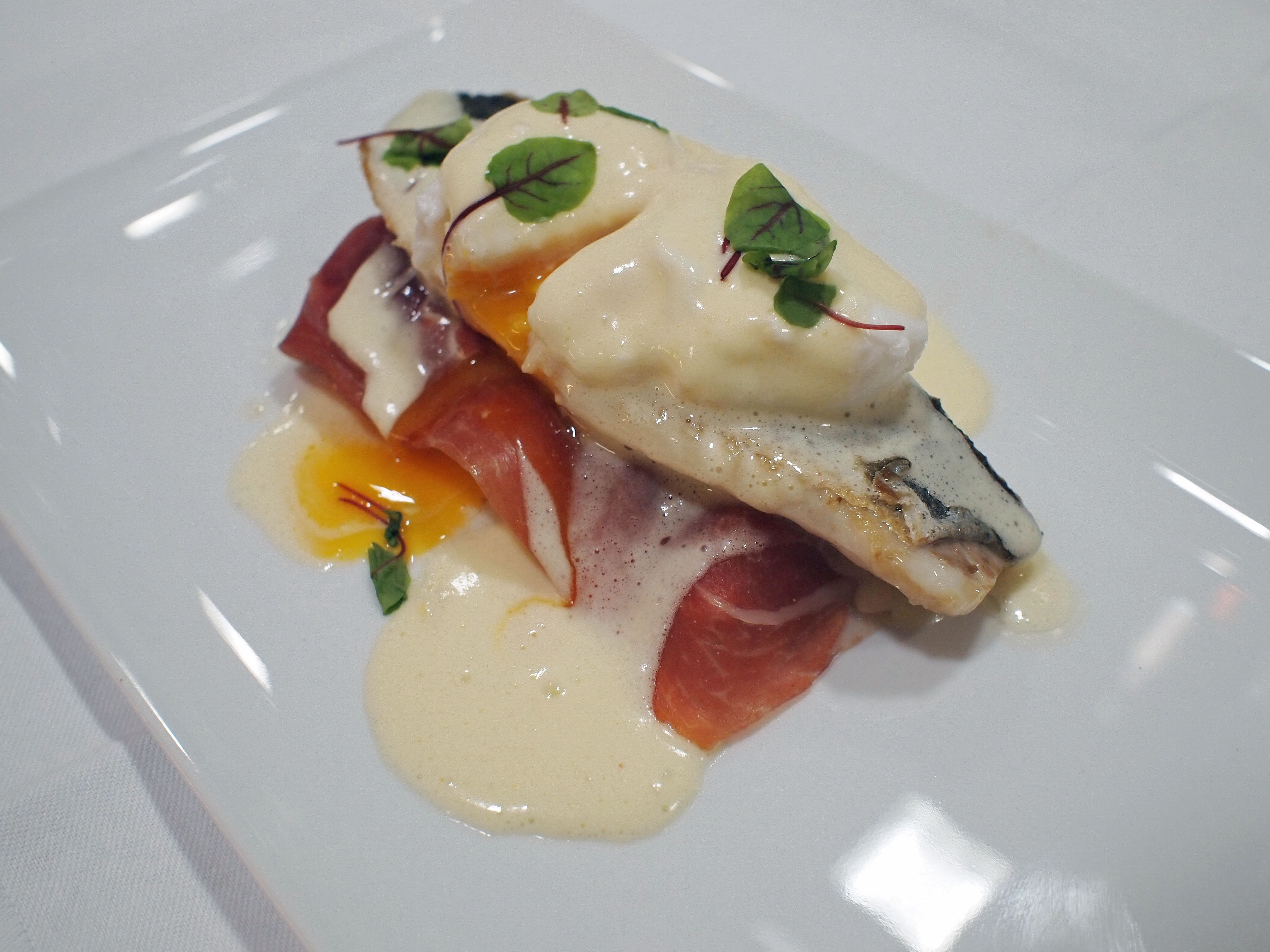 Kruid de vis met zout en peper en bak de zeebaars op de huid in wat olijfolie. Druk goed op de vis zodat het niet kromtrekt. Verdeel de blomkoolroosjes over de borden. Leg een plakje ham op de groenten. Leg een stukje vis met de velkant naar boven op de ham. Leg een eitje op de vis en overgiet met mousselinesaus. Versier met blaadjes zorri cress.