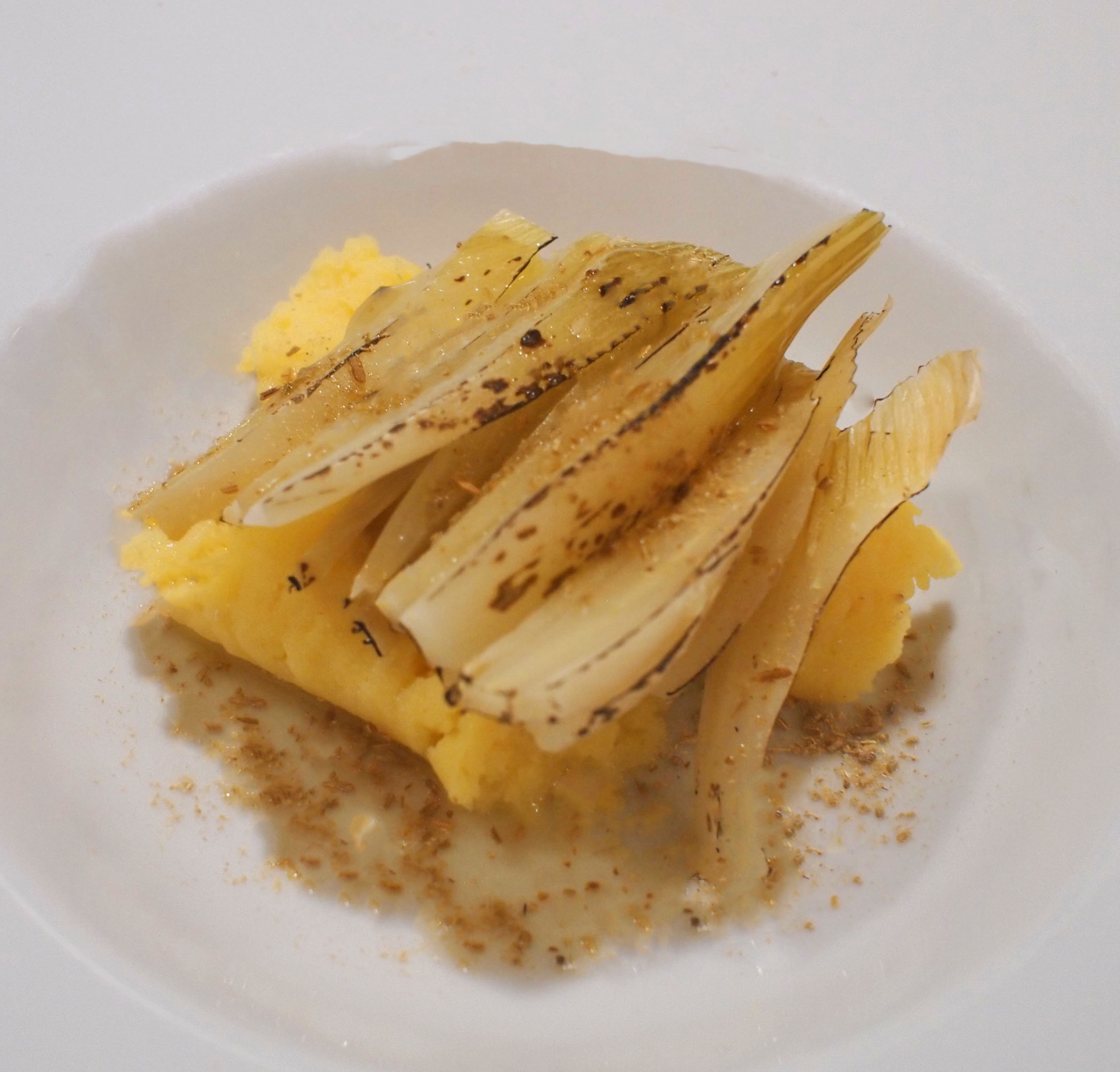 Snij de venkelknollen bij en halveer ze. Weeg de venkel. Doe ze in een vacuümzak met 1% zout en trek vacuüm. Gaar de venkel 60 minuten op 90°C in de sous vide bak. Laat de venkel iets afkoelen en haal de rokken los. Snij de rokken in dunne lamellen met de draad mee en bouw de venkelknol weer op tot zijn oorspronkelijke vorm. Brand de venkel rondom met de gasbrander tot er overal zwarte puntjes ontstaan op de venkel.