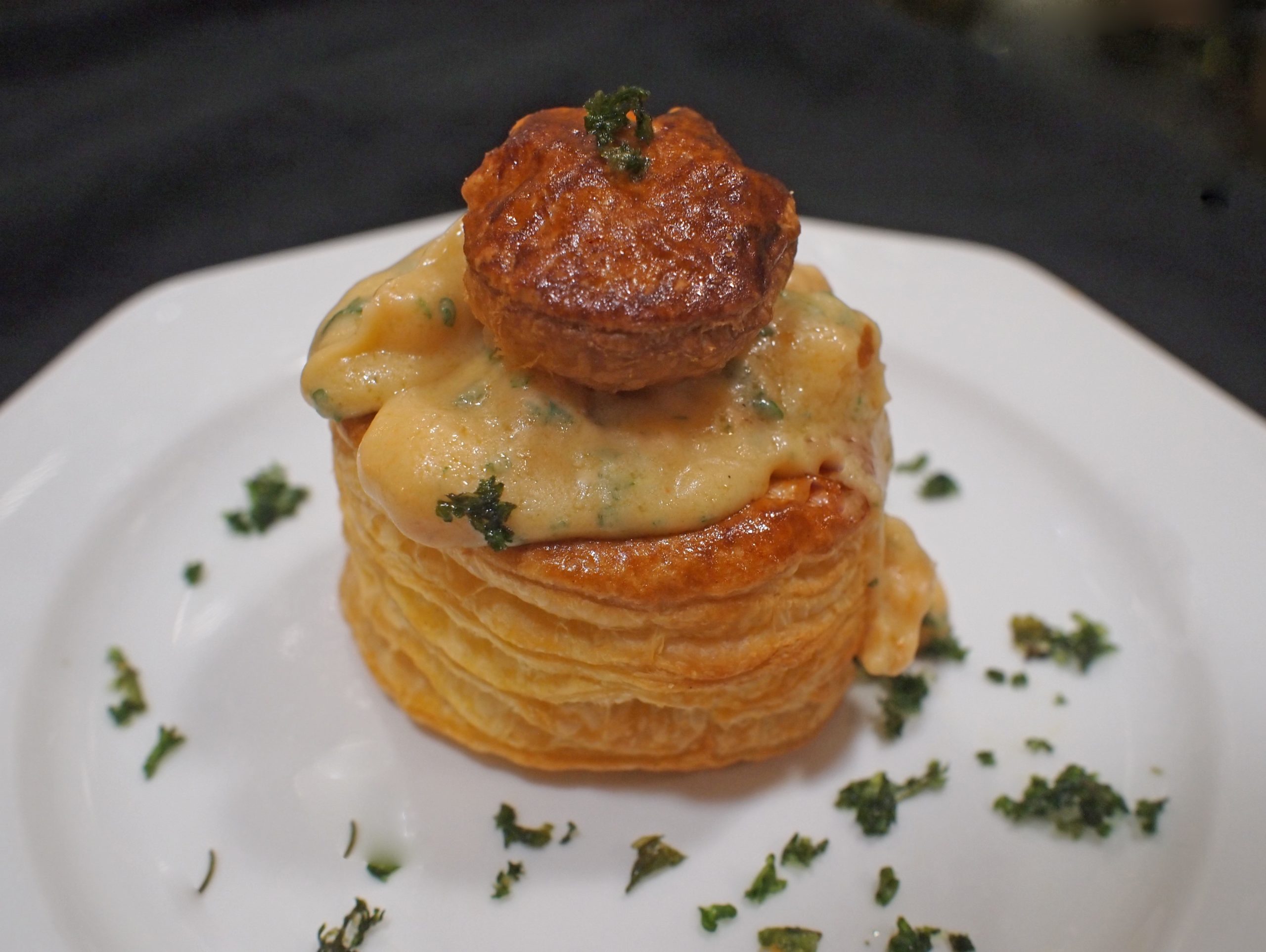 Roer de garnalen door de warme roux. Proef en voeg eventueel nog wat citroensap toe. Leg een bladerdeegbakje op de borden en verdeel de garnalenroux hierin. Leg een deksel erop en versier met wat krokante peterselie.