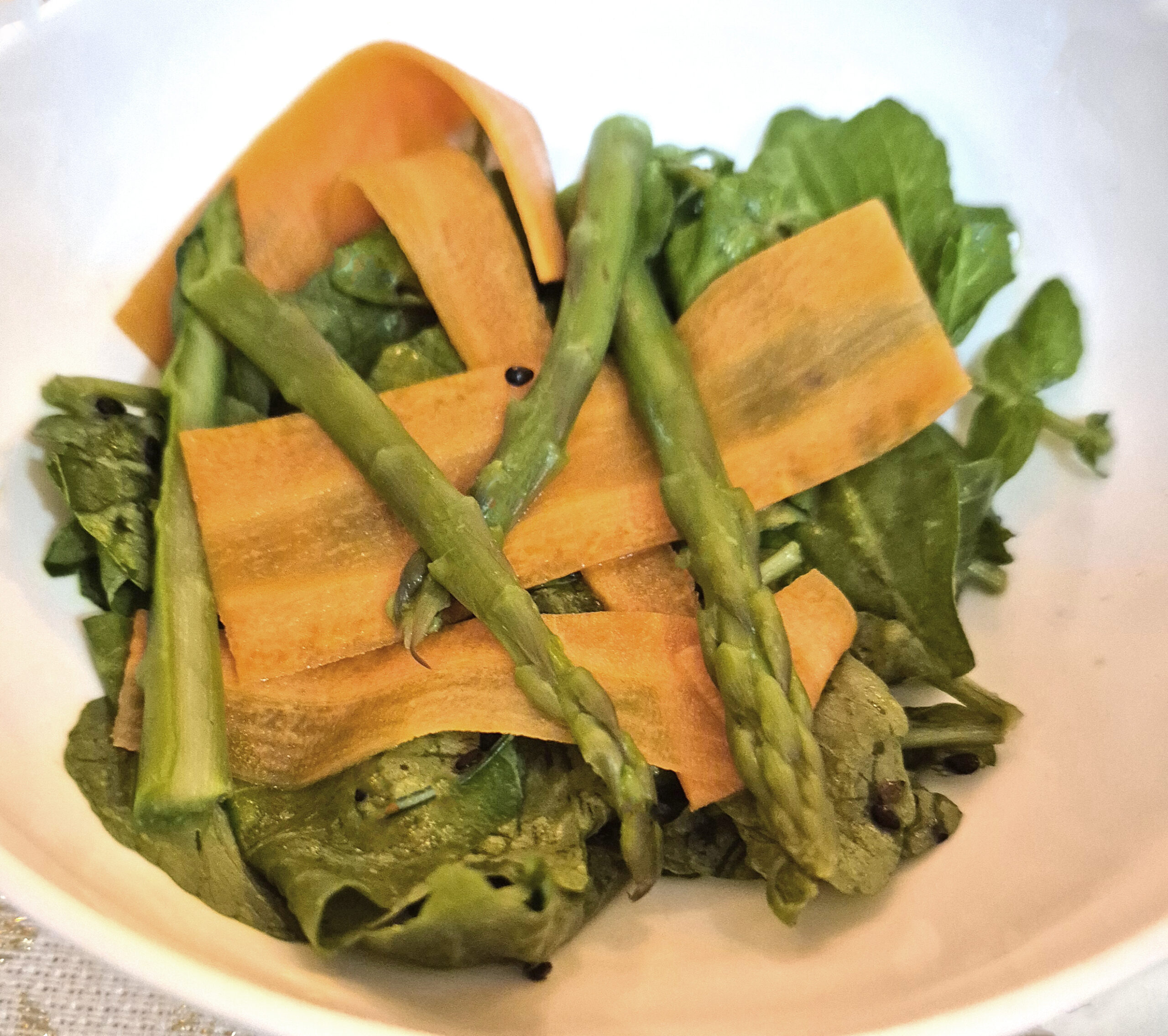 Doe de salade in kommetjes en garneer met de wortel en de asperges.